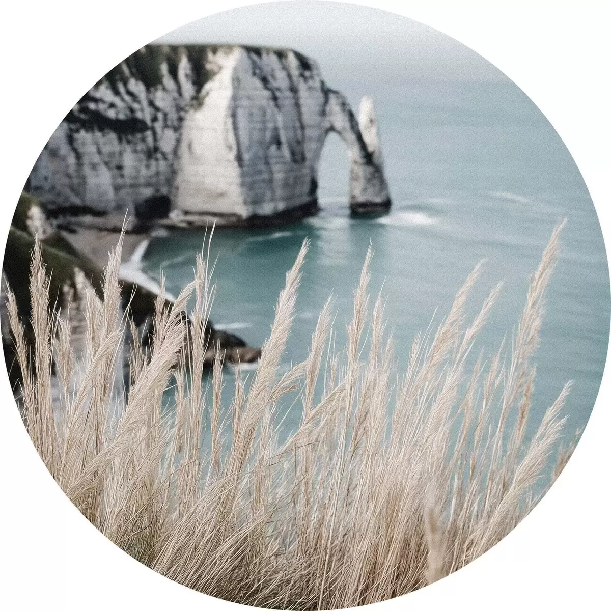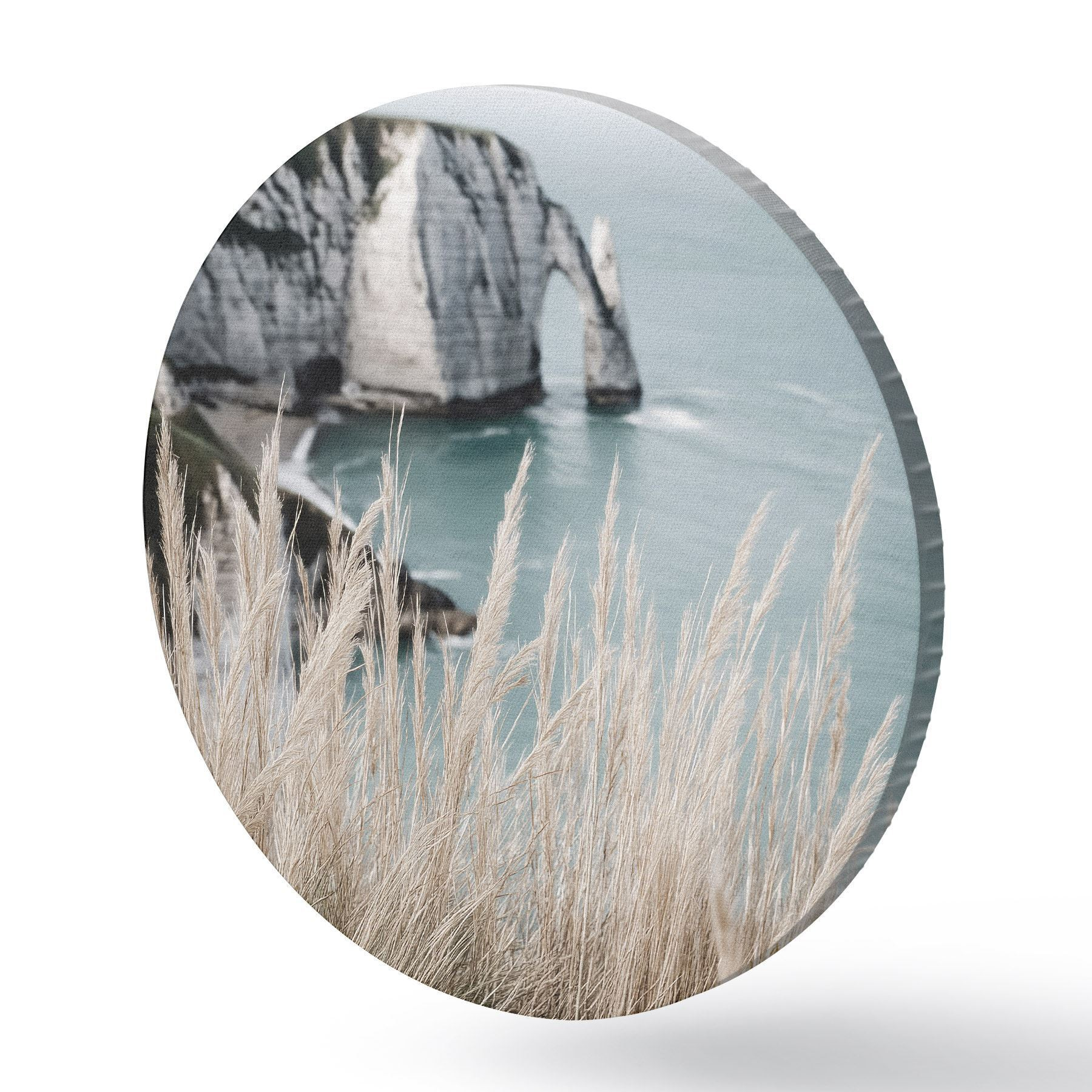 Tableaux ronds Mer et arche rocheuse, vue à travers les herbes sèches r46142