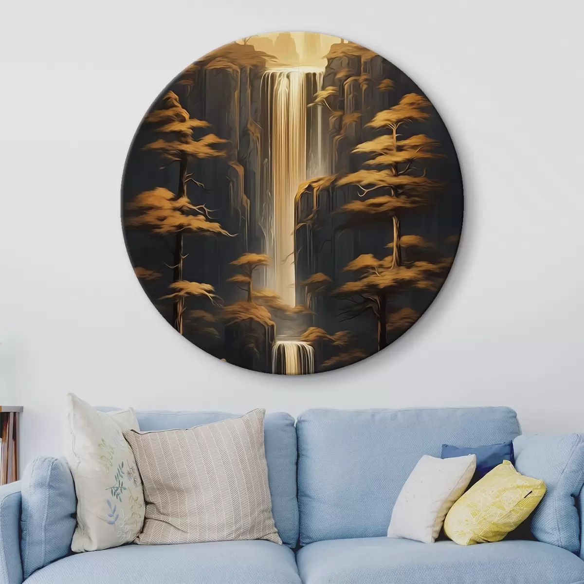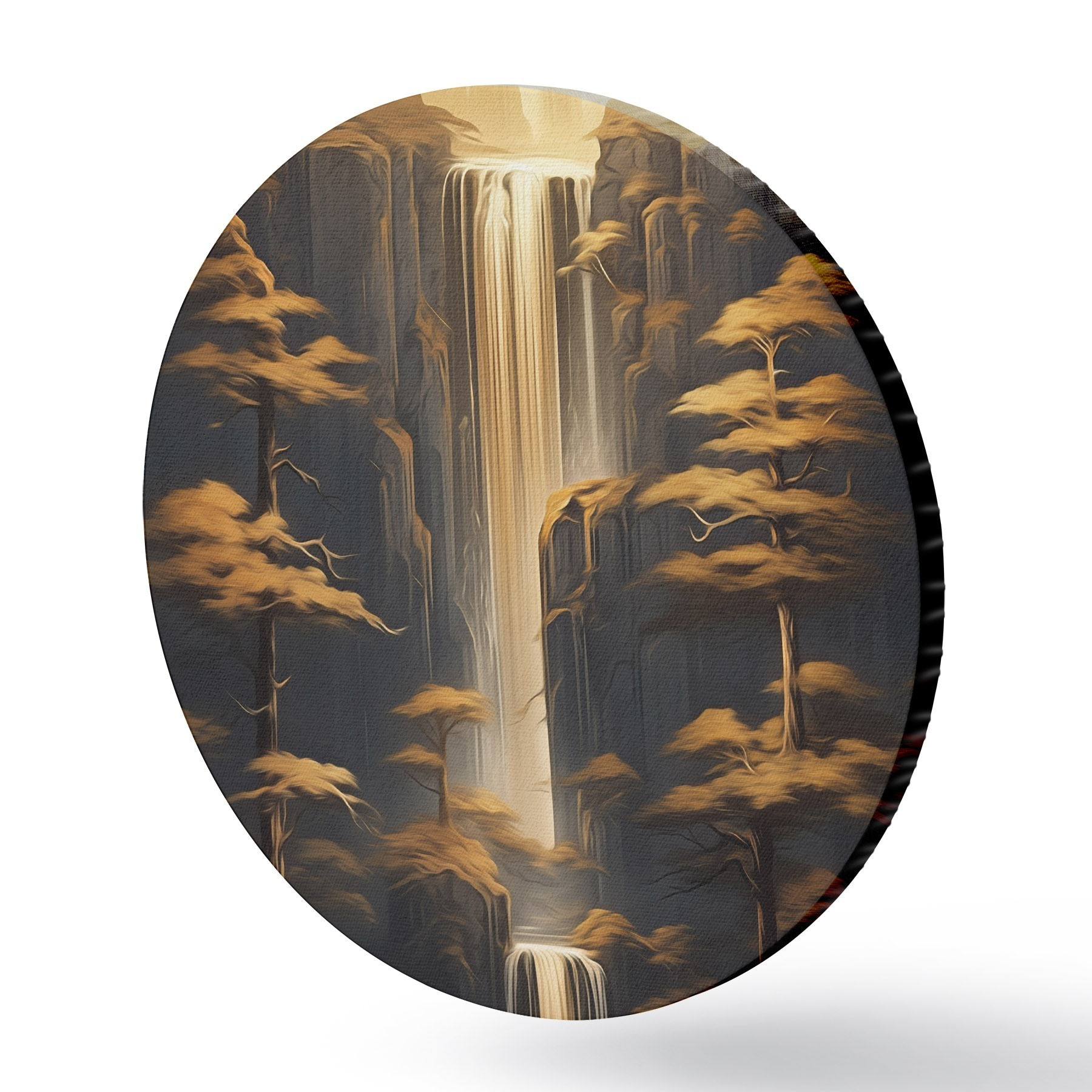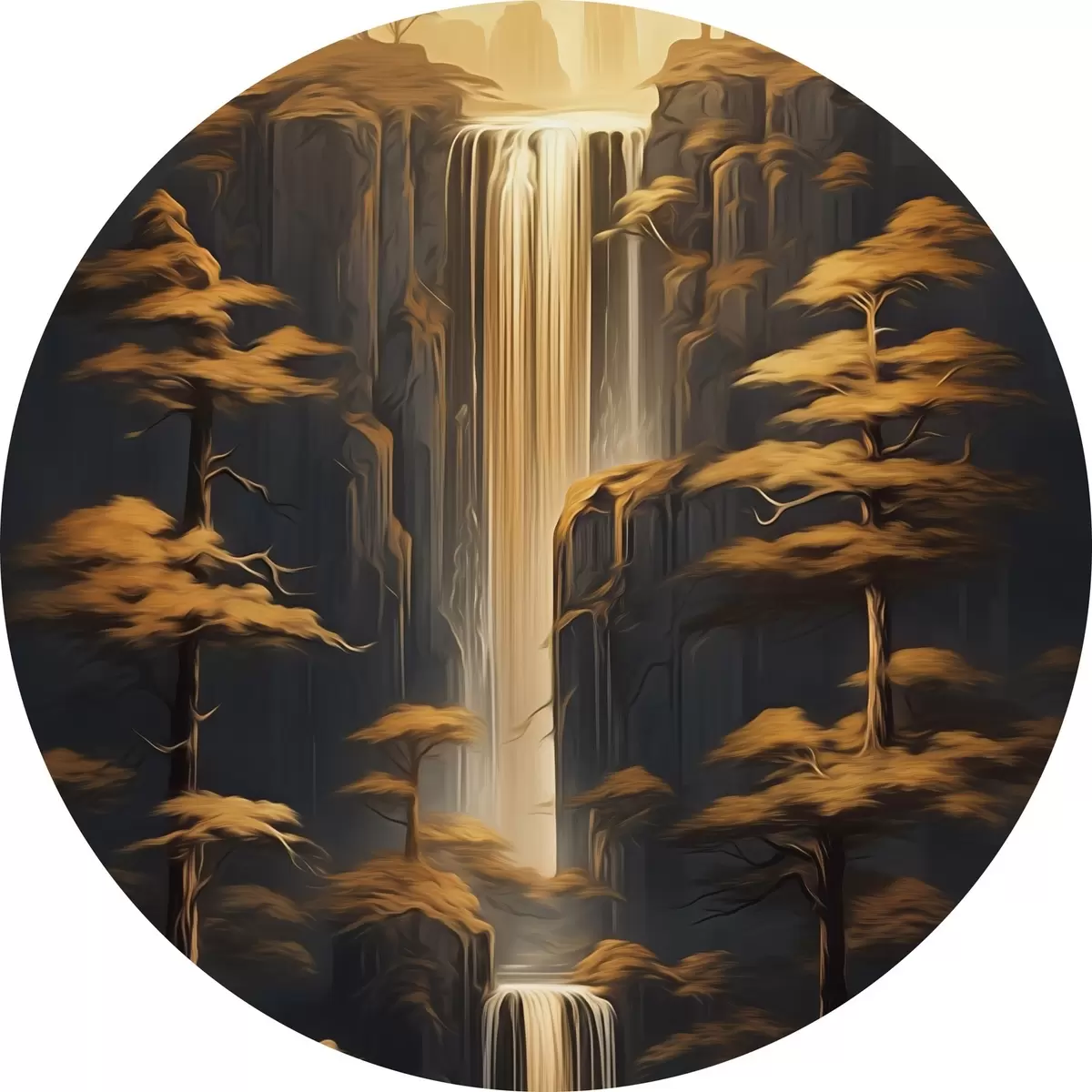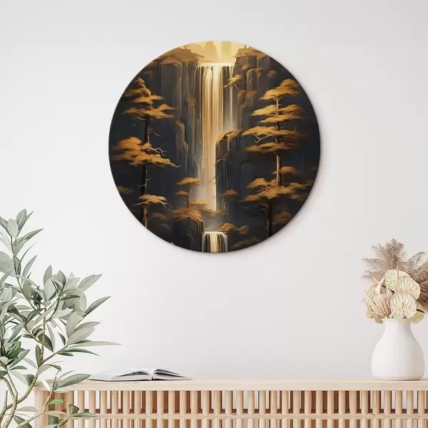 Tableaux ronds Hautes falaises avec une cascade et des pins dans la lumière du soir r46151