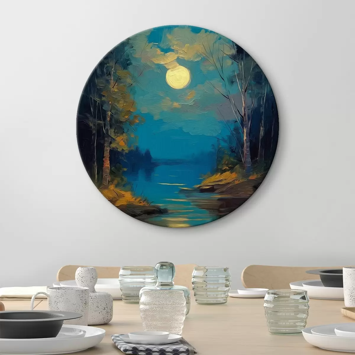 Tableaux ronds Clair de lune sur une rivière calme au milieu des pins r46164