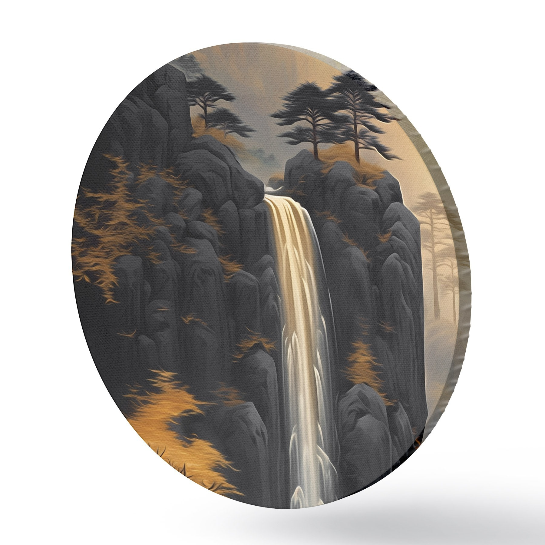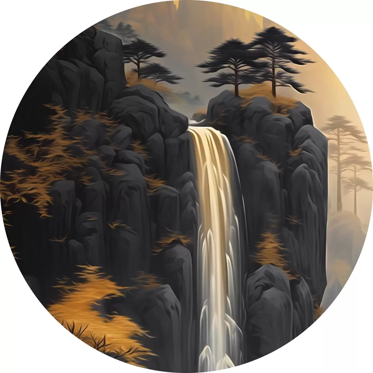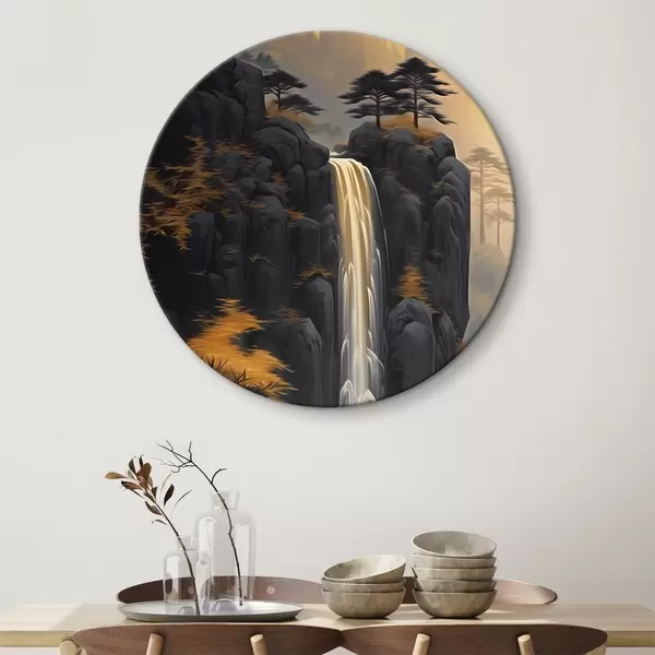 Tableaux ronds Paysage rocheux avec une cascade dans les tons chauds du coucher de soleil r46177