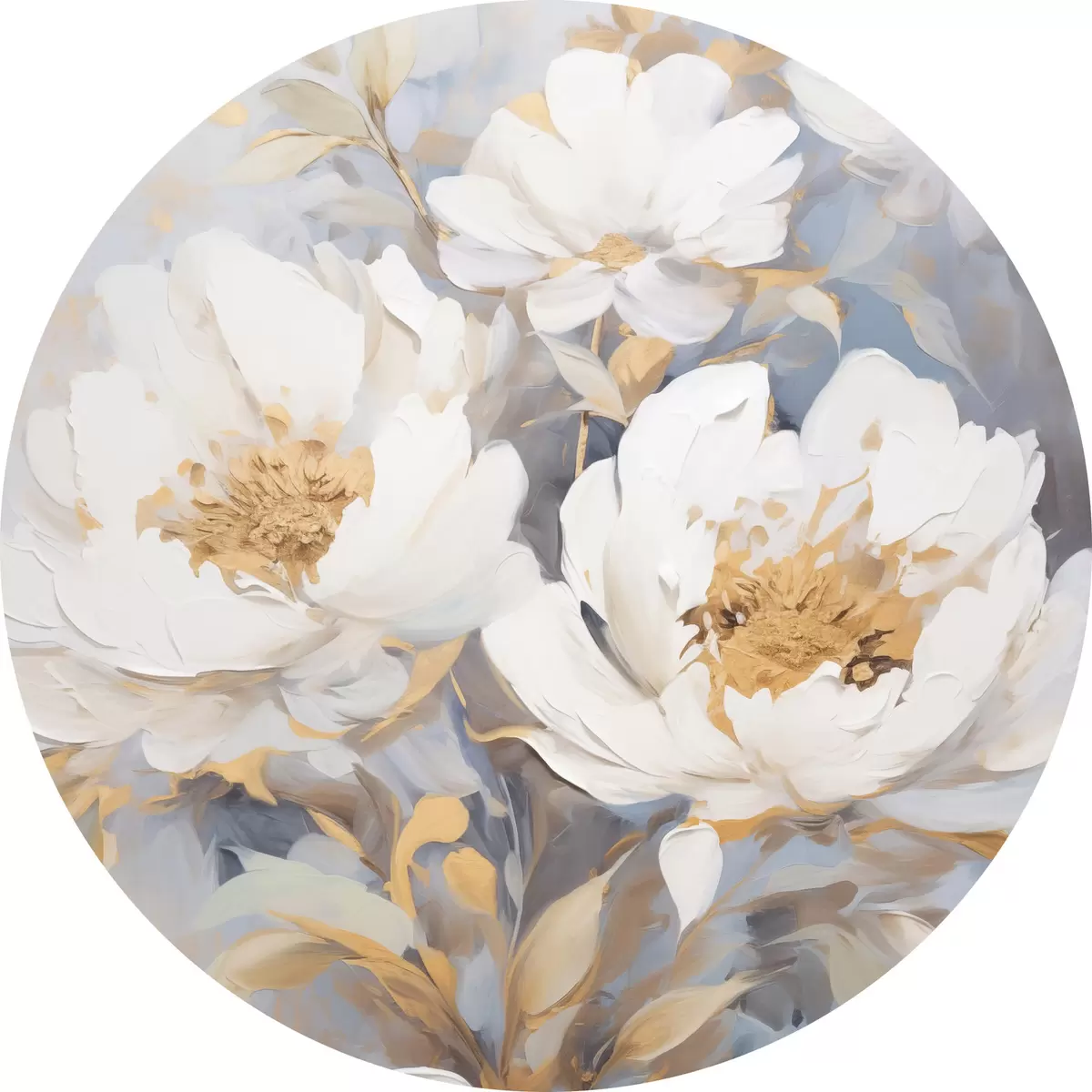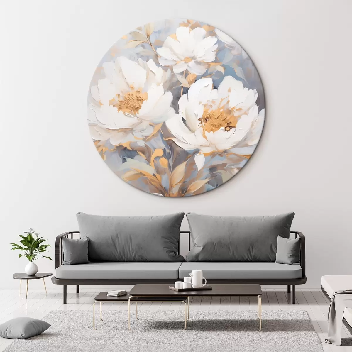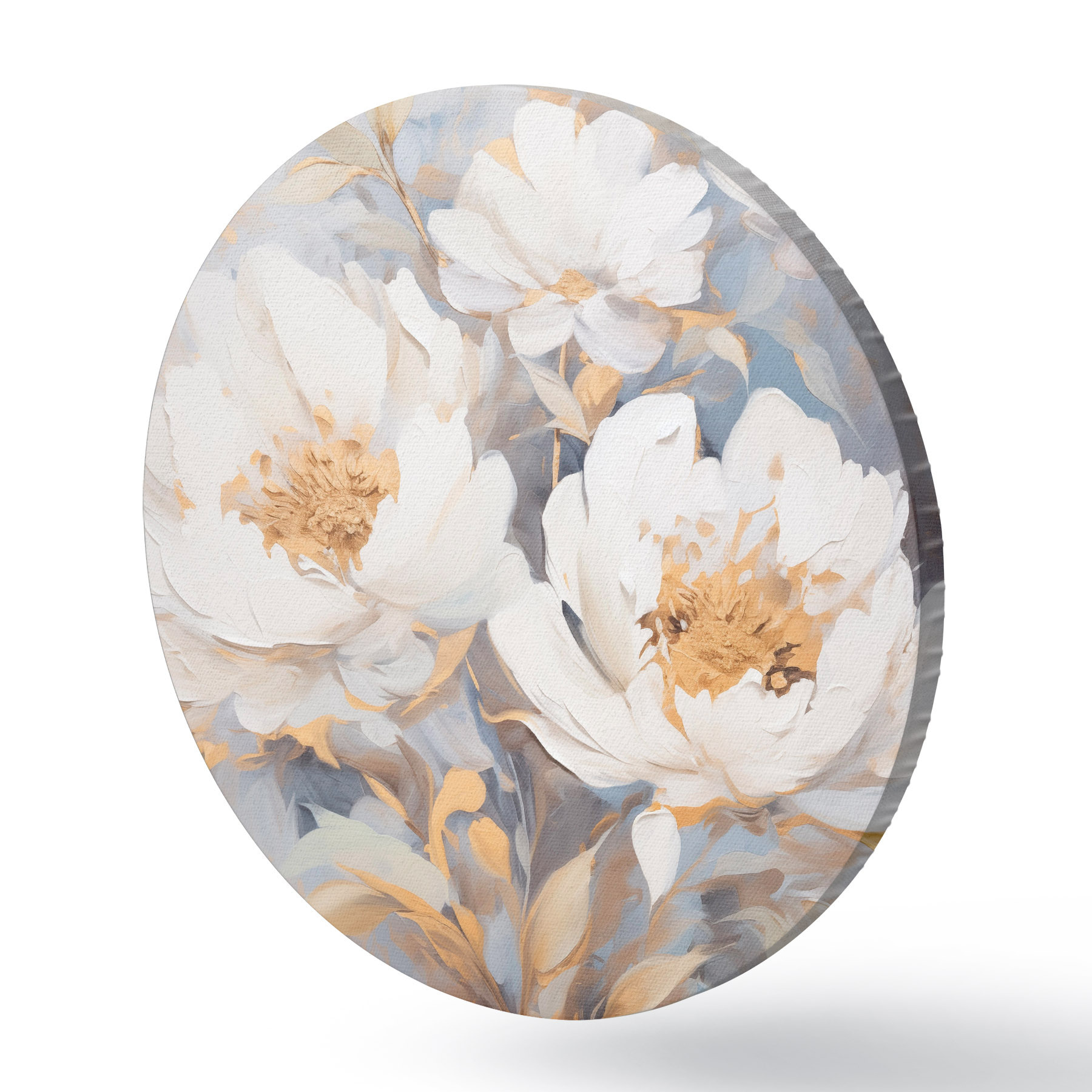 Tableaux ronds Pivoines blanches avec cœur et feuilles bleus, coups de pinceau doux, fond bleu clair, composition florale r46270