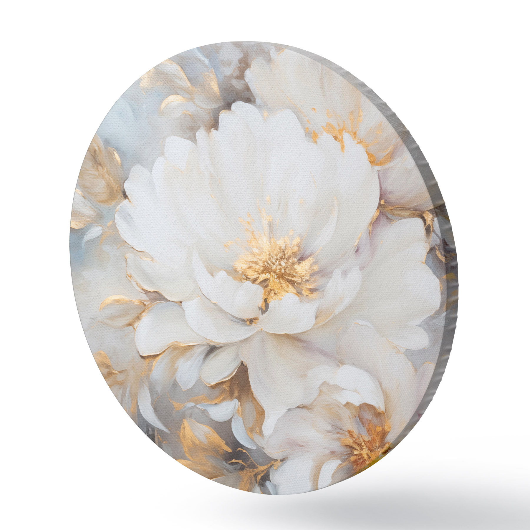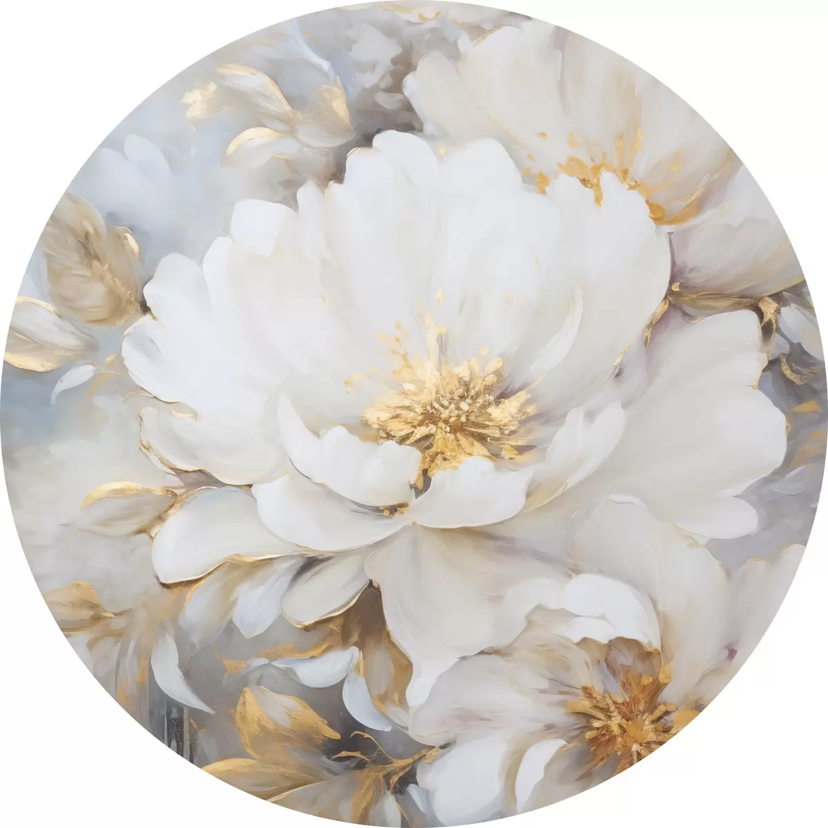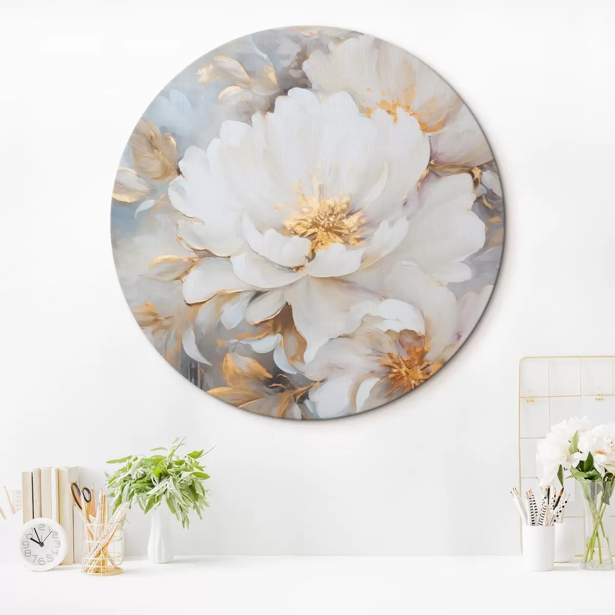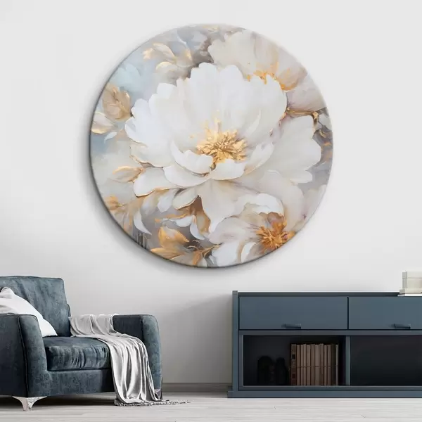 Tableaux ronds Pivoines blanches avec cœur et feuilles bleus, coups de pinceau doux, fond bleu clair, composition florale r46271