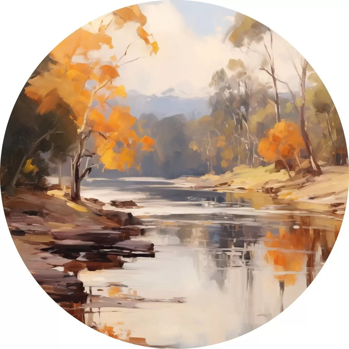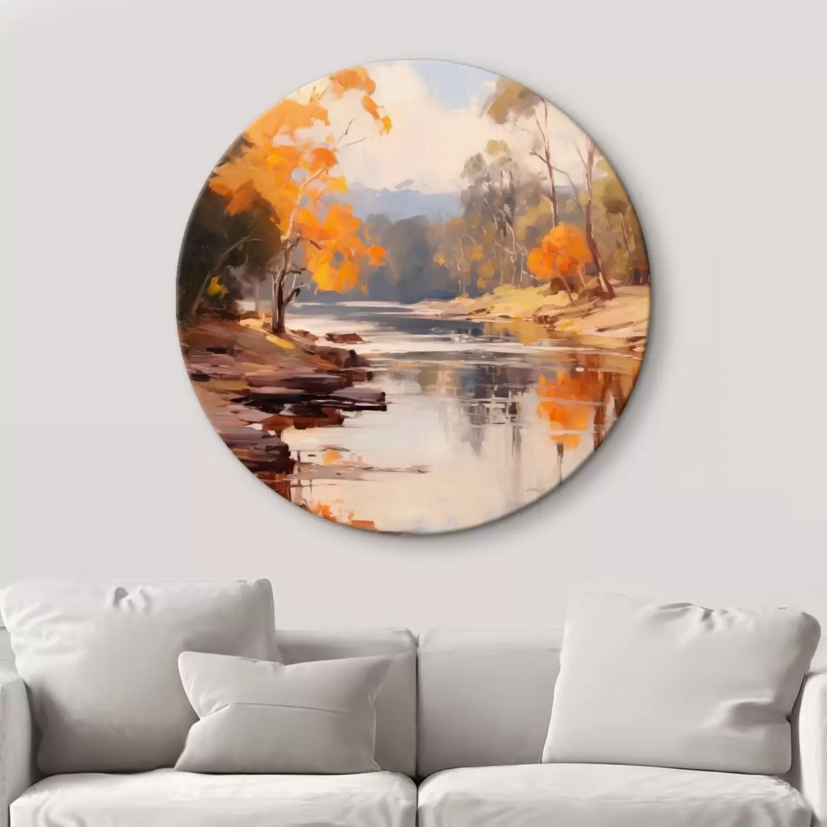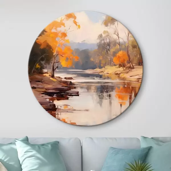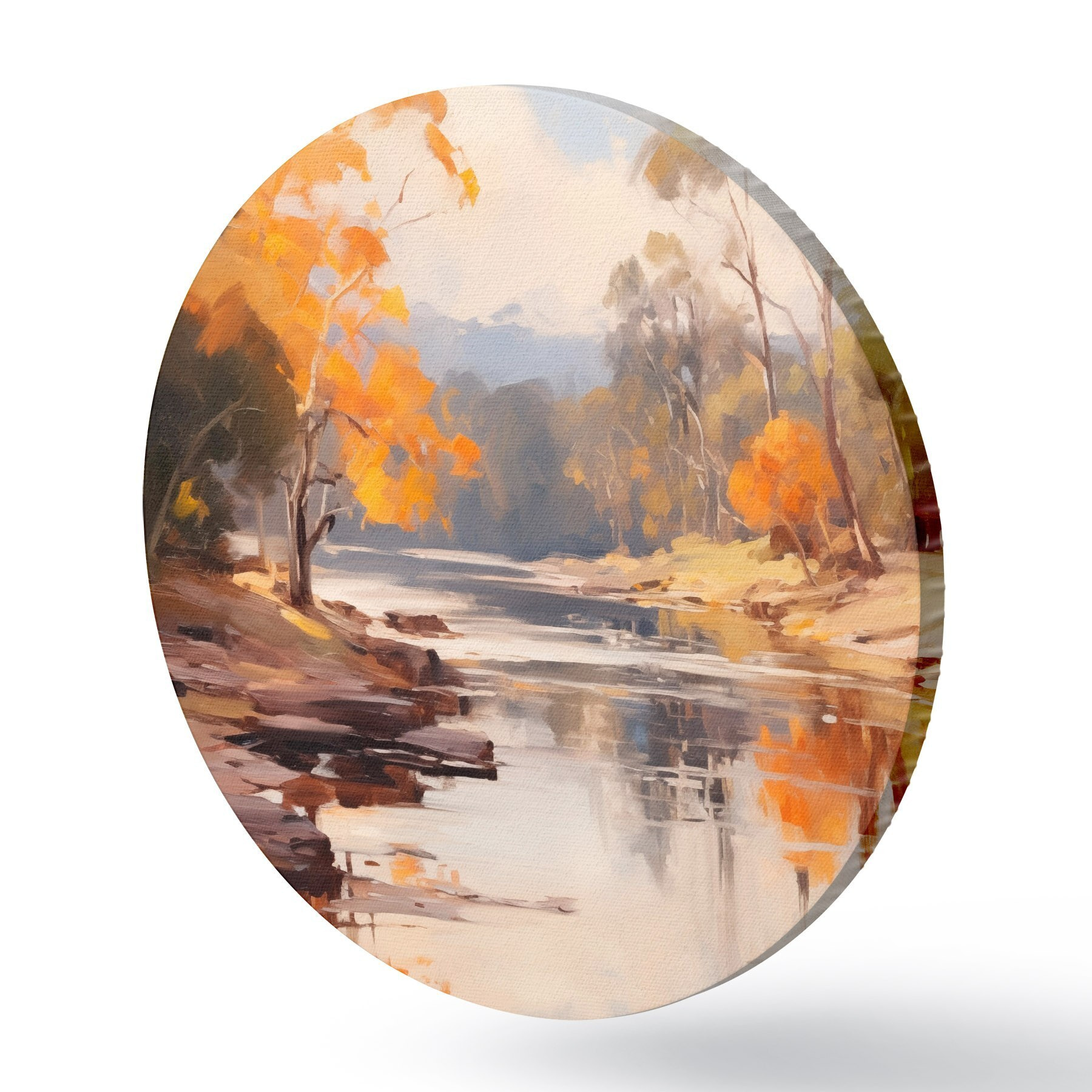 Tableaux ronds Paysage automnal, rivière bordée d'arbres, forêt en arrière-plan, reflets sur l'eau r46280