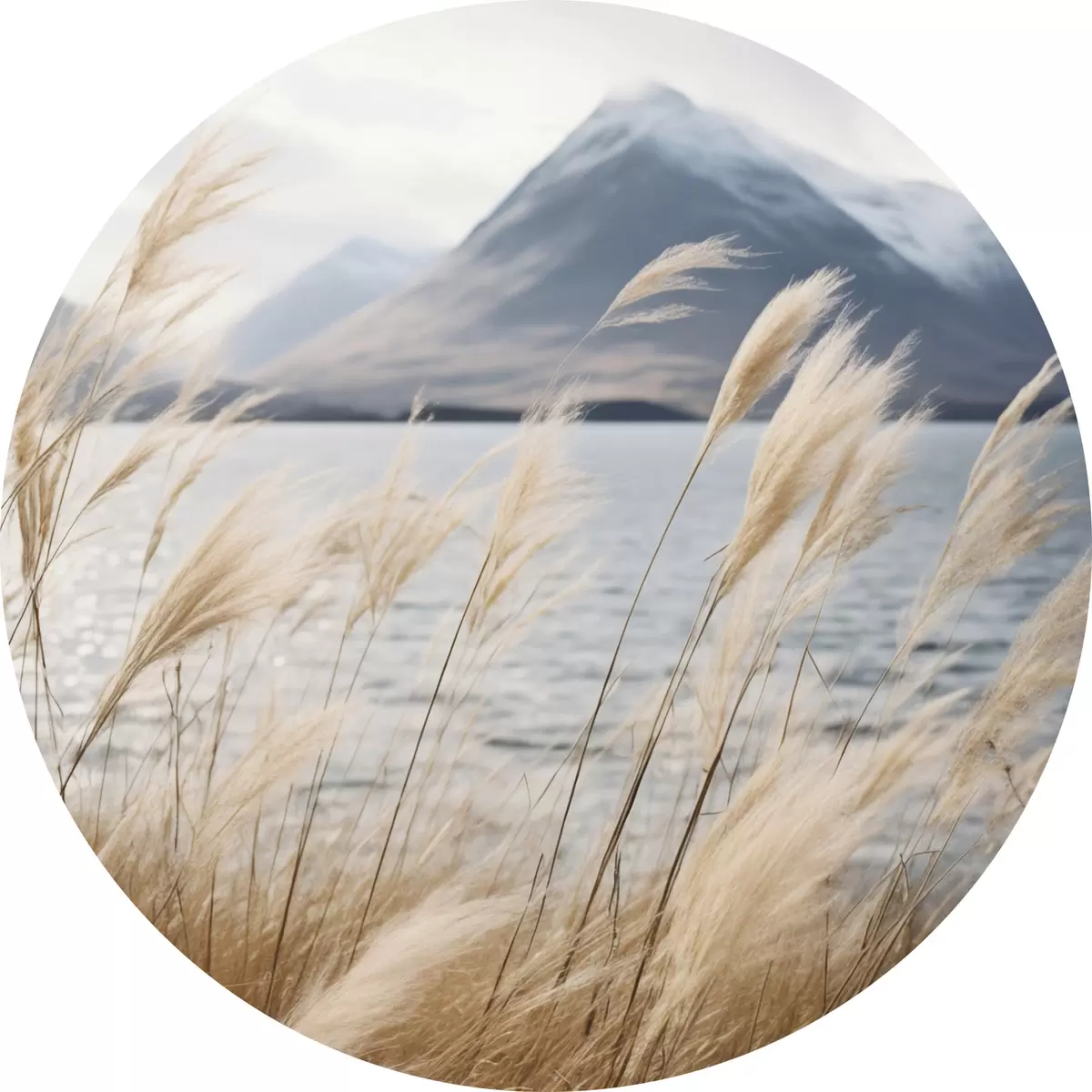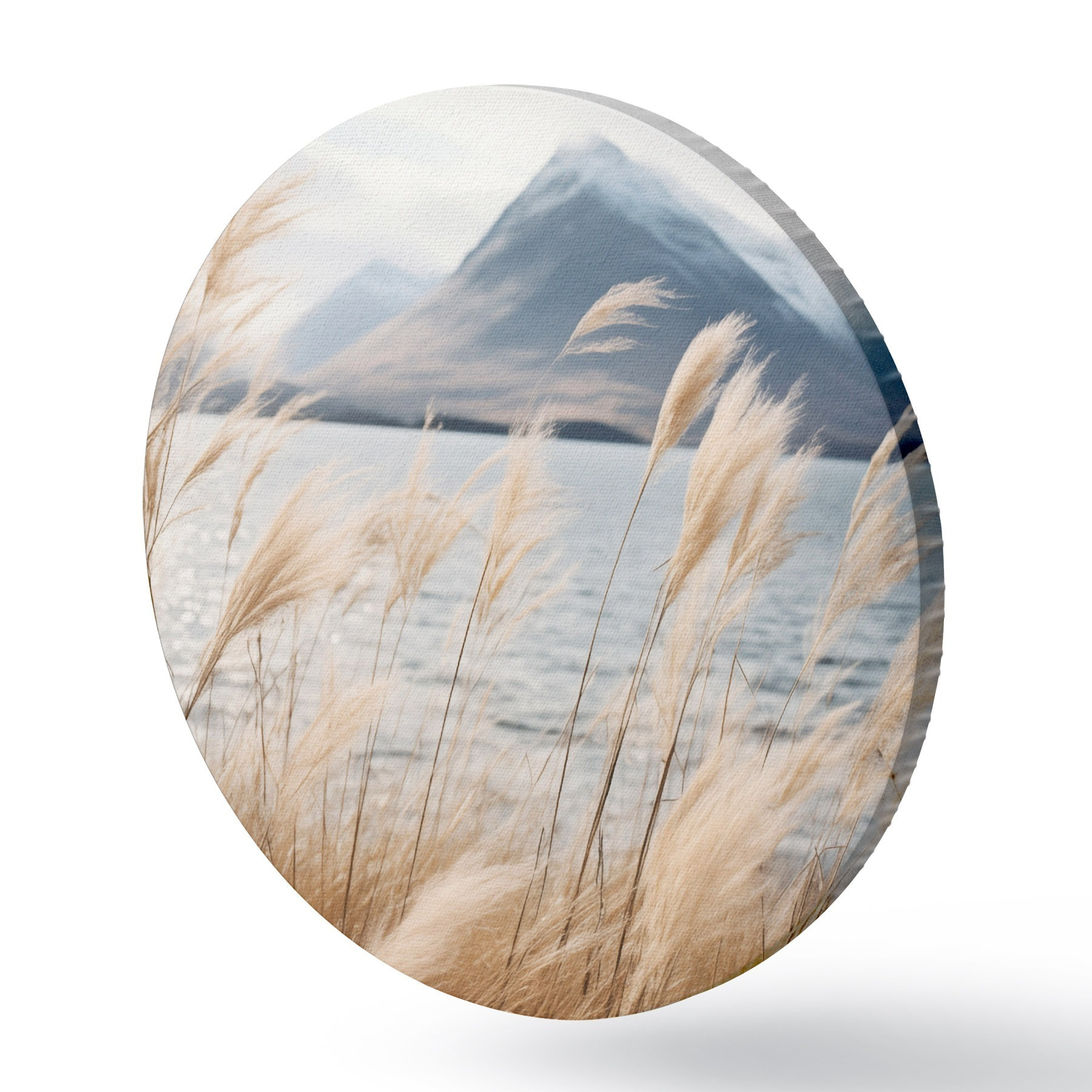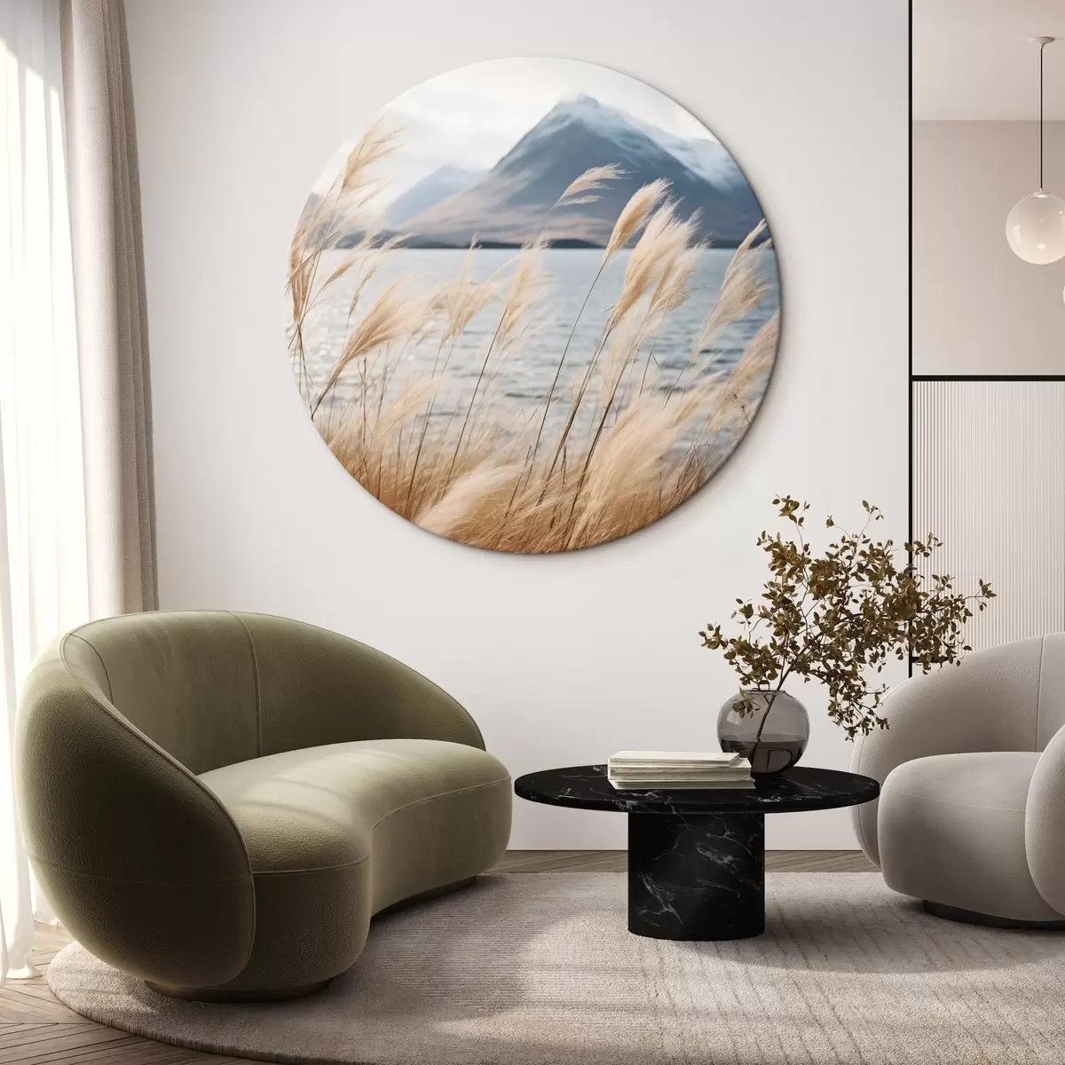Tableaux ronds Herbe de la pampa avec un lac et des montagnes en arrière-plan, éclairage tamisé, couleurs douces, style naturaliste r46283