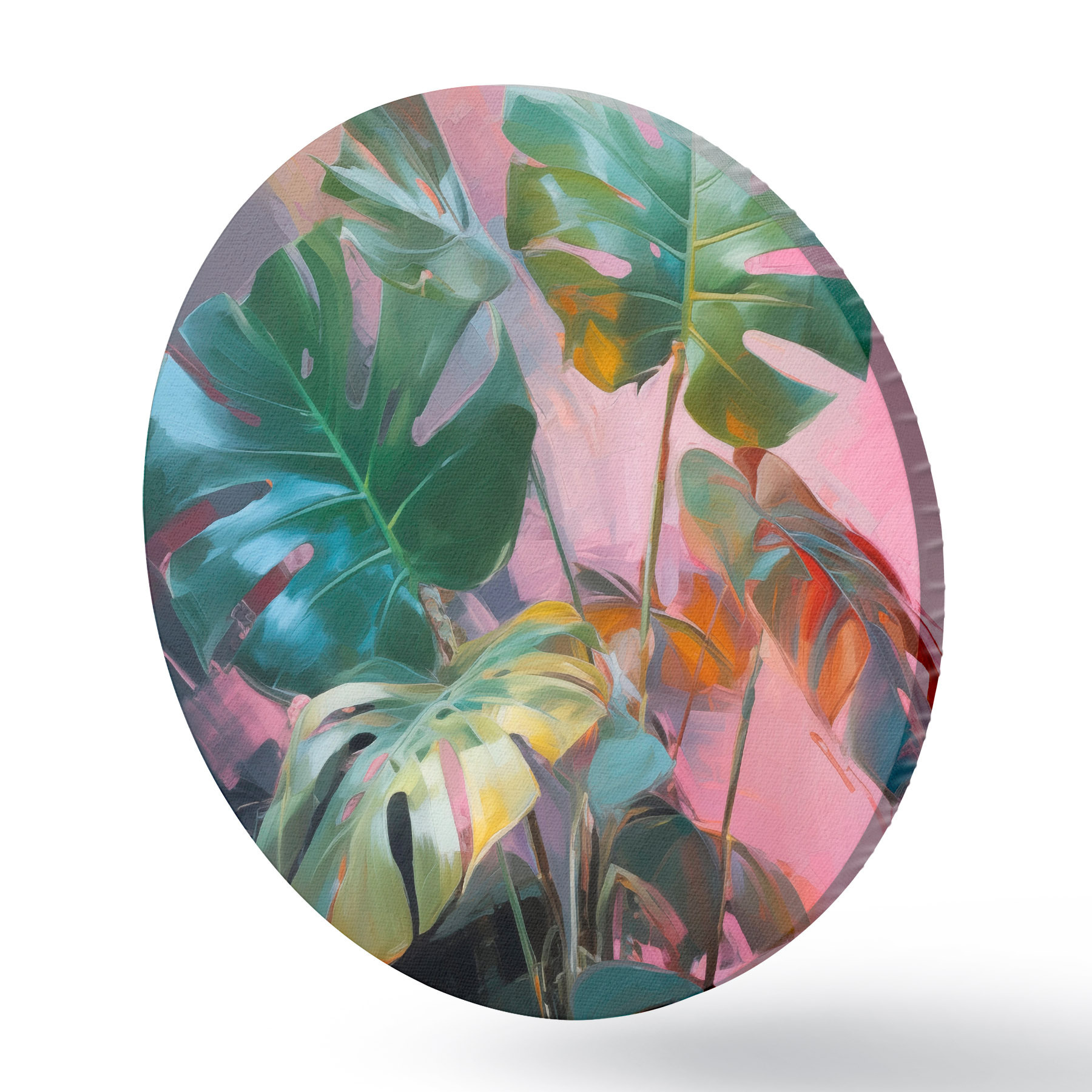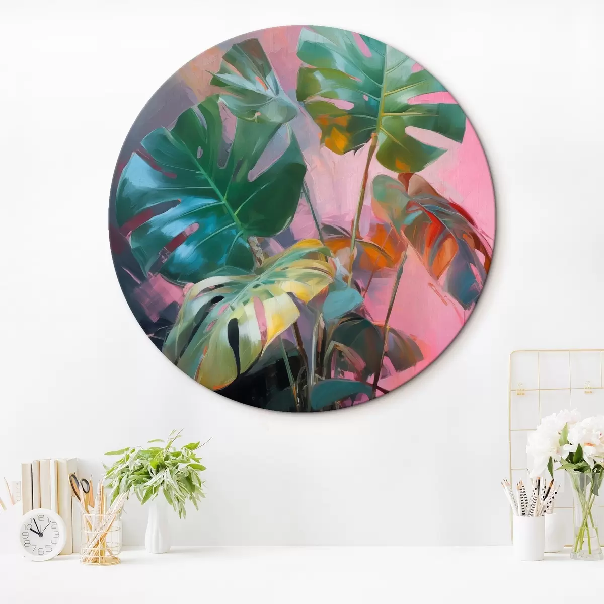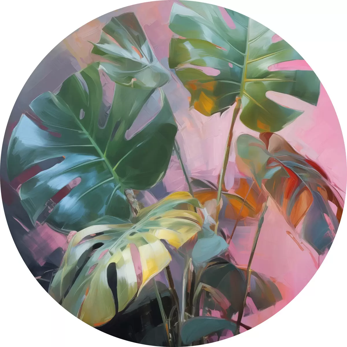Tableaux ronds Plante abstraite monstera aux feuilles d'un vert éclatant, sur fond de douces teintes roses et violettes r46286