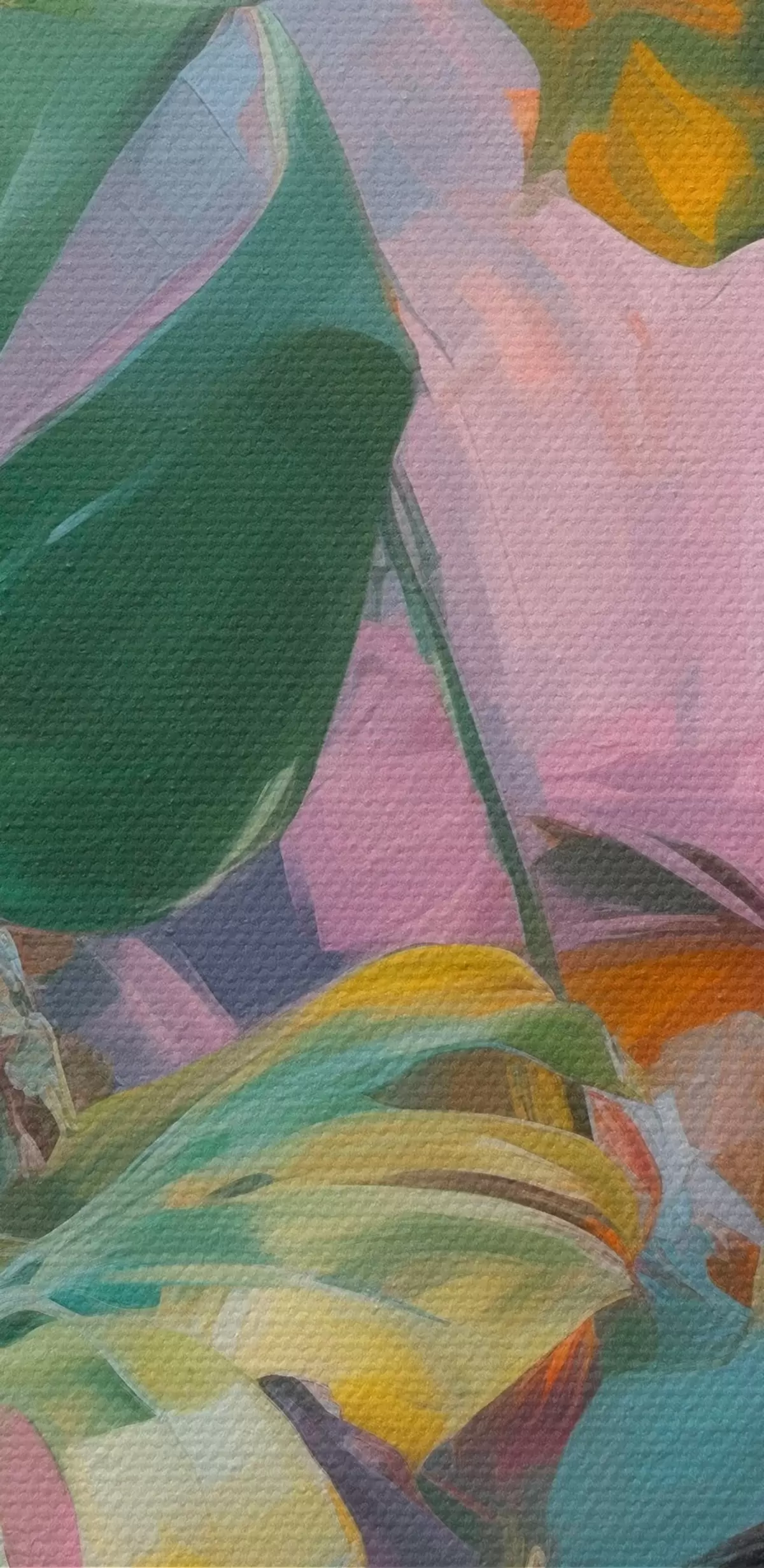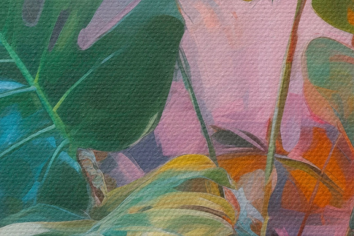 Image Plante abstraite monstera aux feuilles d'un vert éclatant, sur fond de douces teintes roses et violettes Nr r46286