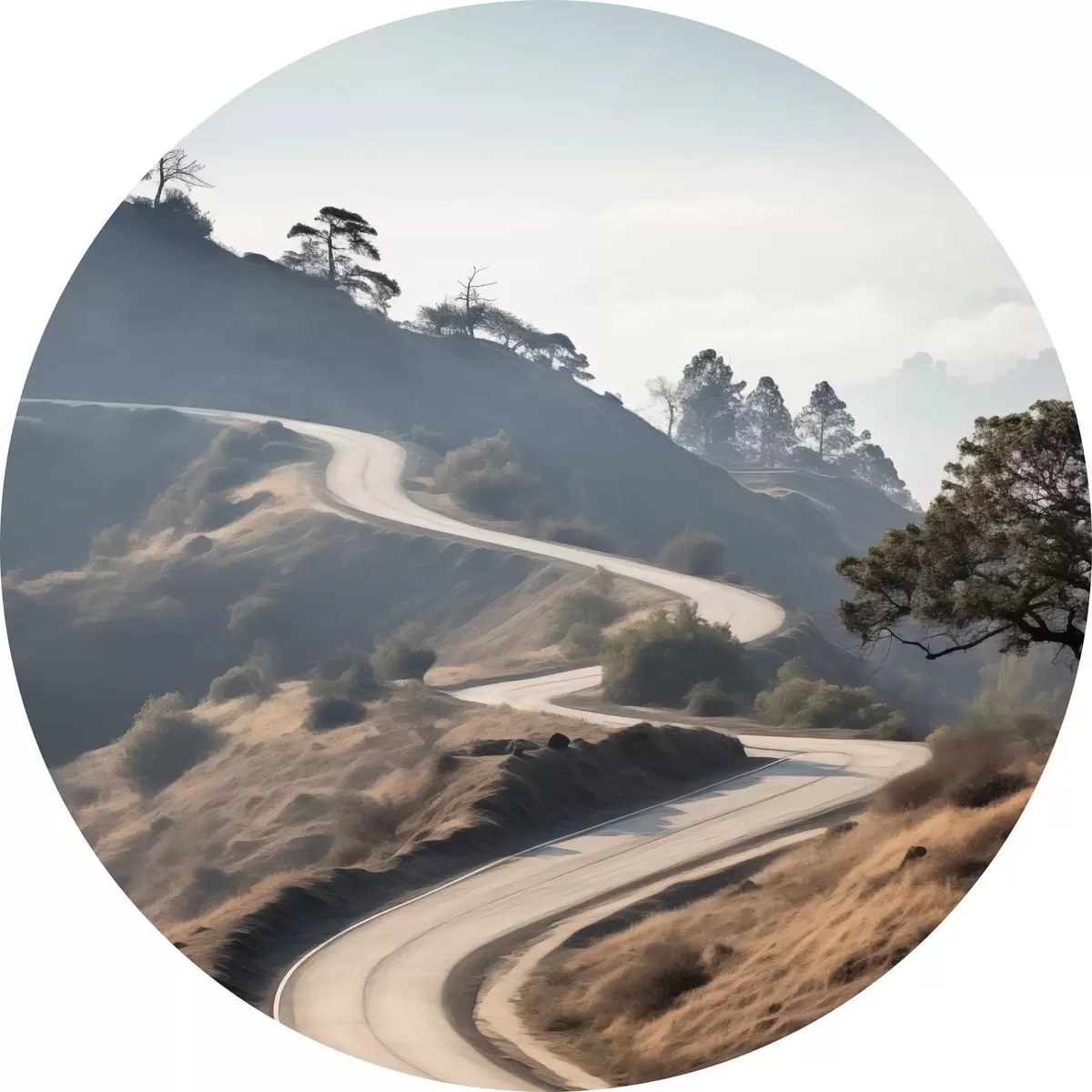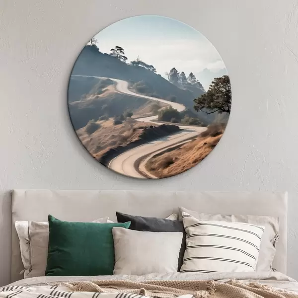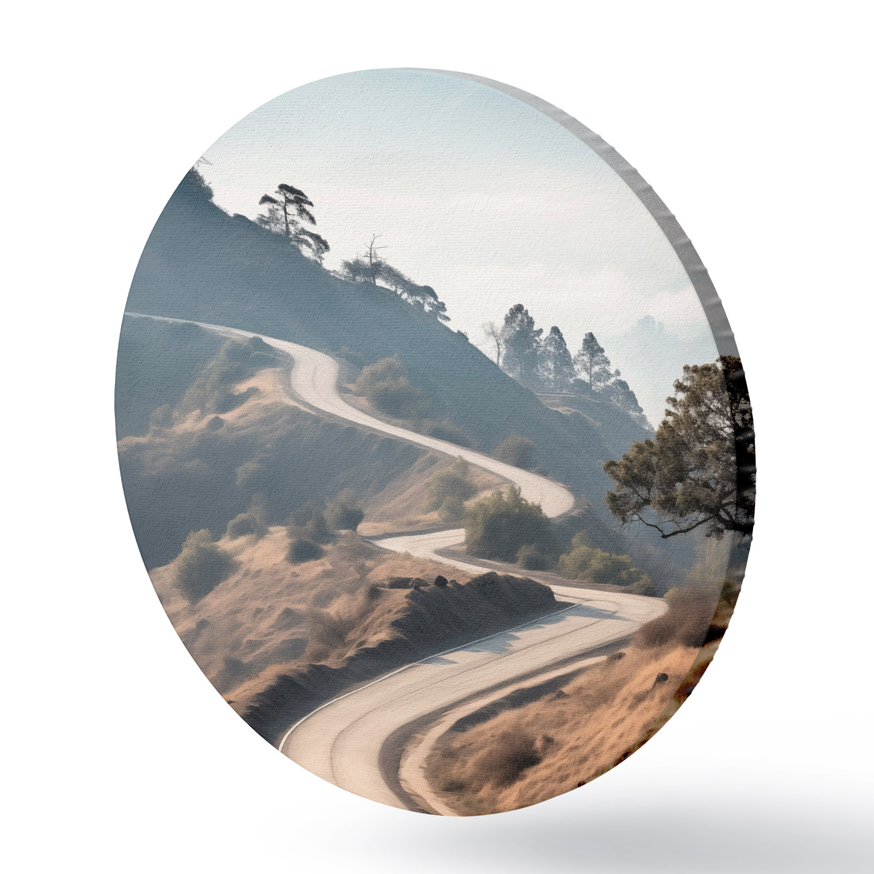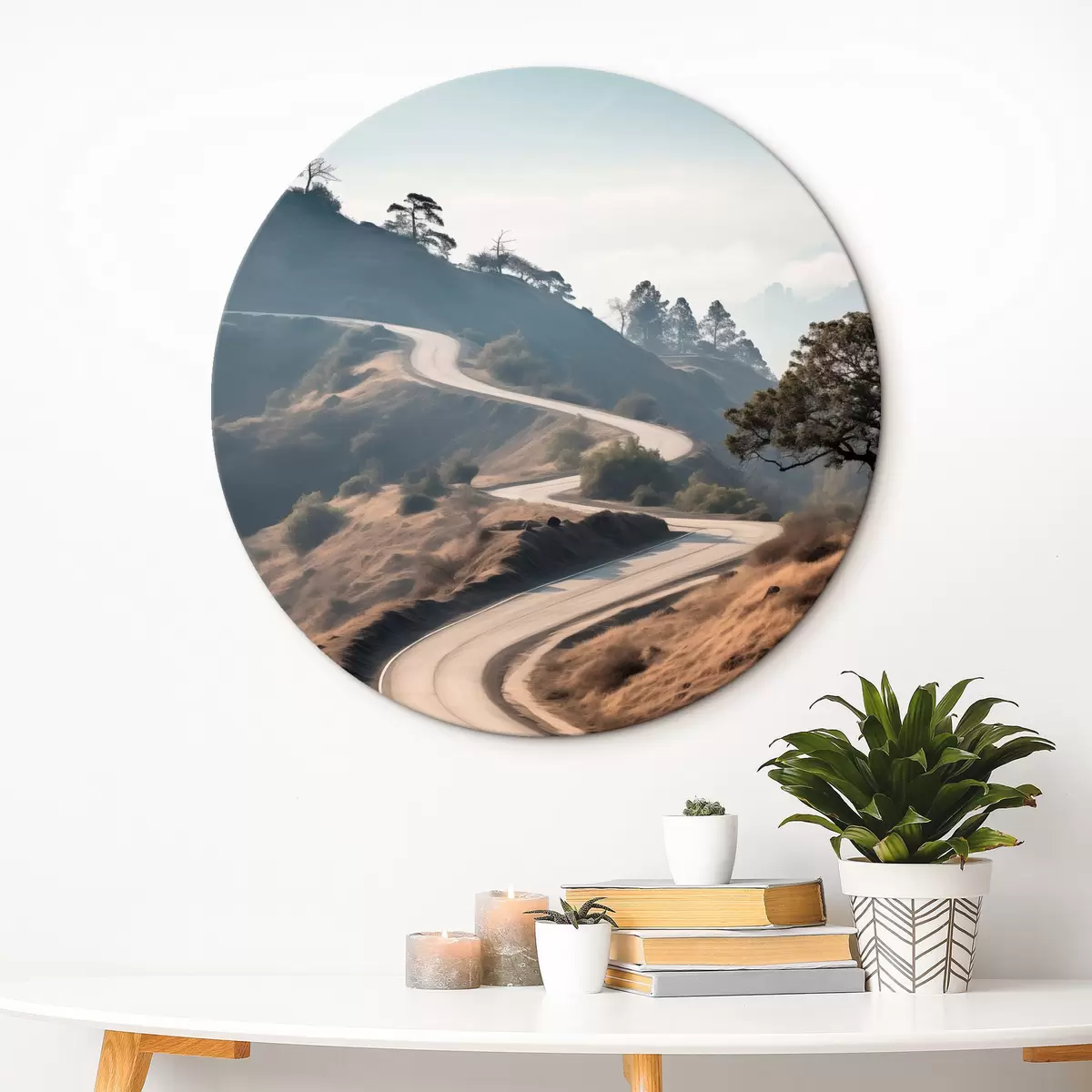 Tableaux ronds Une route sinueuse à travers un paysage vallonné recouvert d'herbe sèche, sous un ciel clair, avec des montagnes au loin r46289