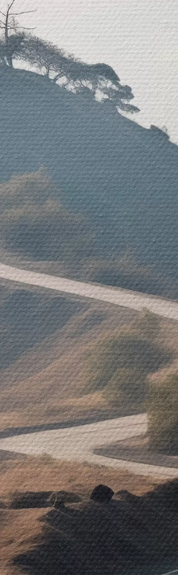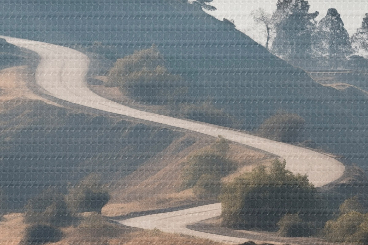Image Une route sinueuse à travers un paysage vallonné recouvert d'herbe sèche, sous un ciel clair, avec des montagnes au loin Nr r46289