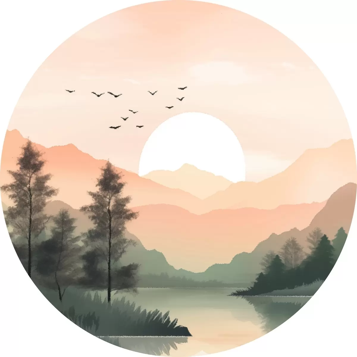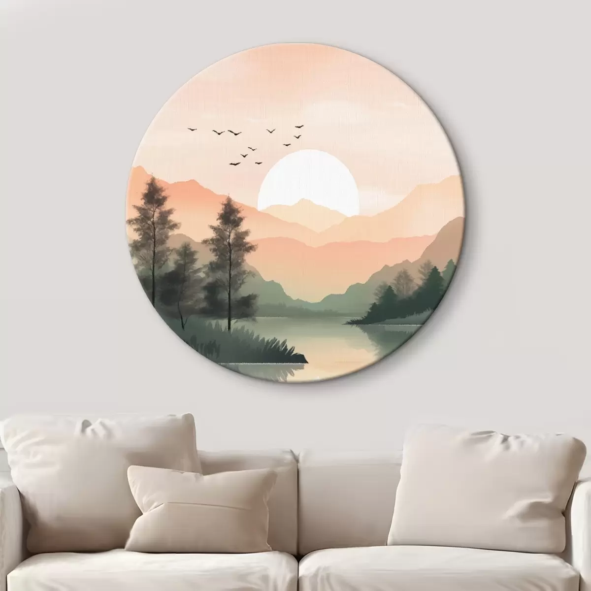 Tableaux ronds Coucher de soleil pastel sur un lac tranquille avec des collines lointaines et des oiseaux r46508