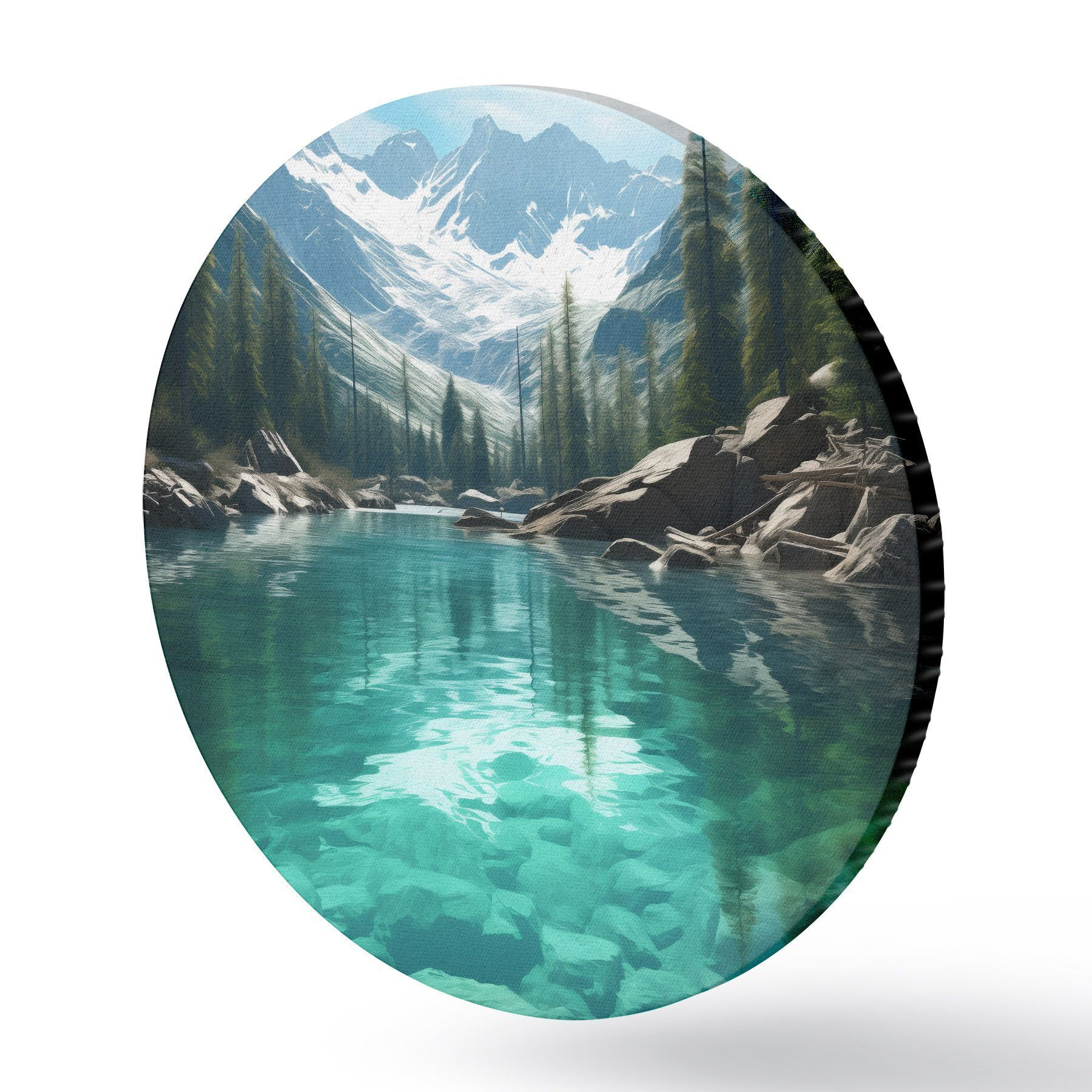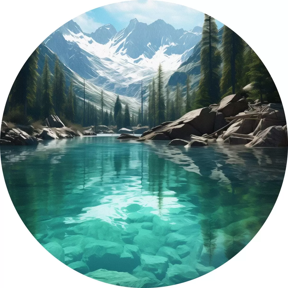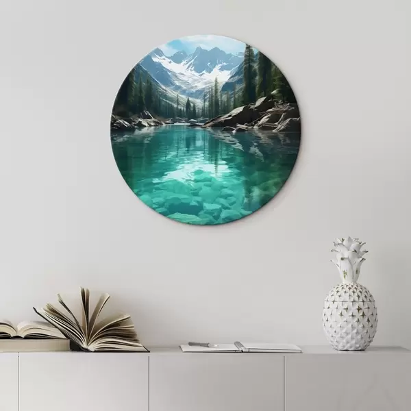Tableaux ronds Rivière alpine limpide avec lit rocheux et sommets enneigés r46514