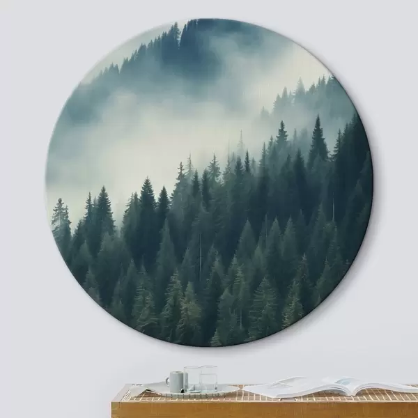 Tableaux ronds Brouillard sur les pentes couvertes de conifères, tons vert foncé r46516