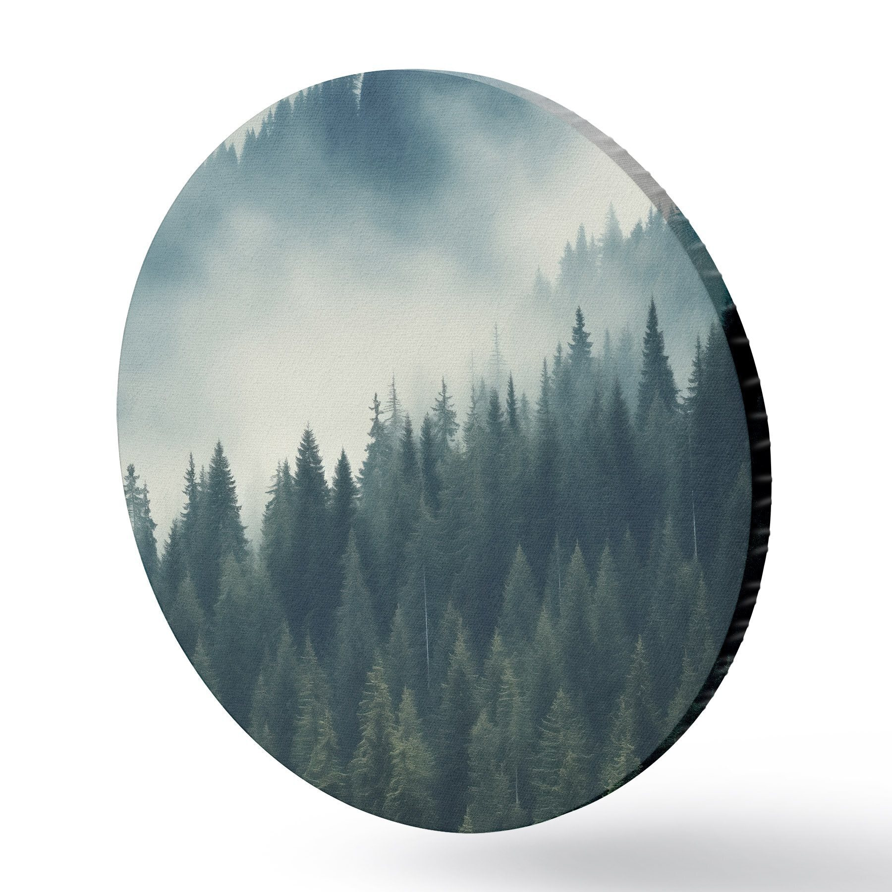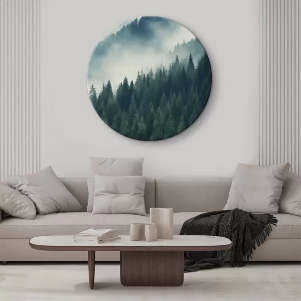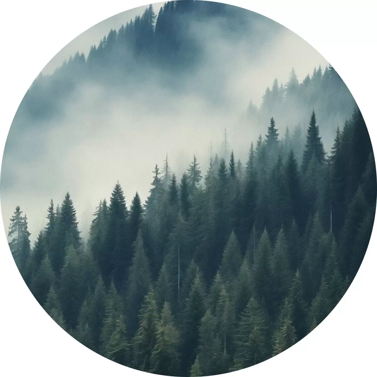 Tableaux ronds Brouillard sur les pentes couvertes de conifères, tons vert foncé r46516