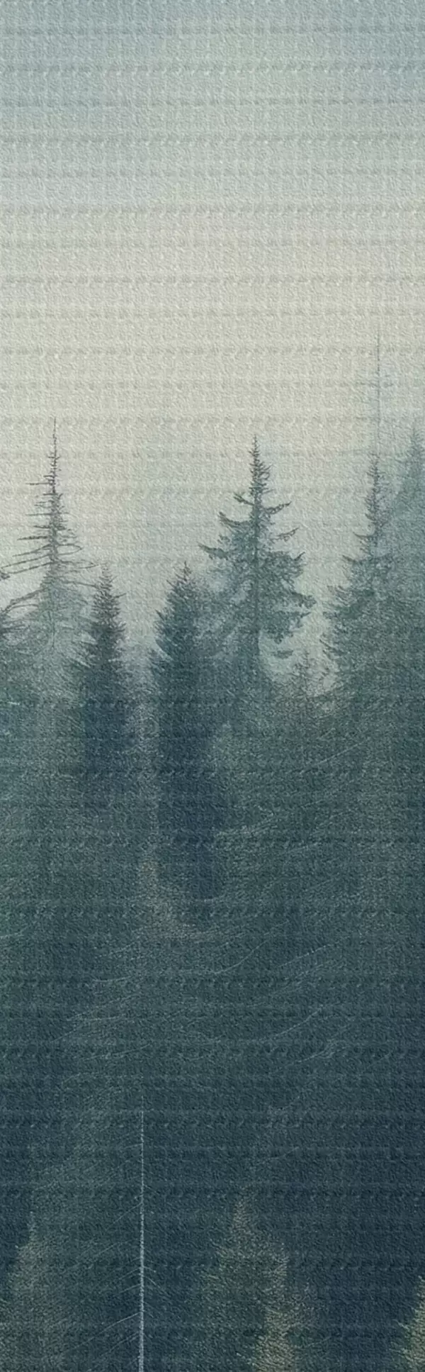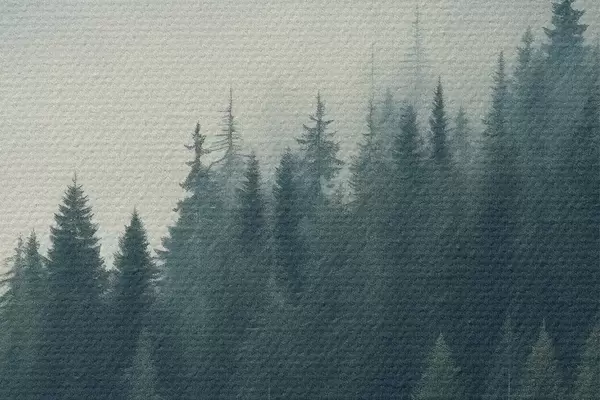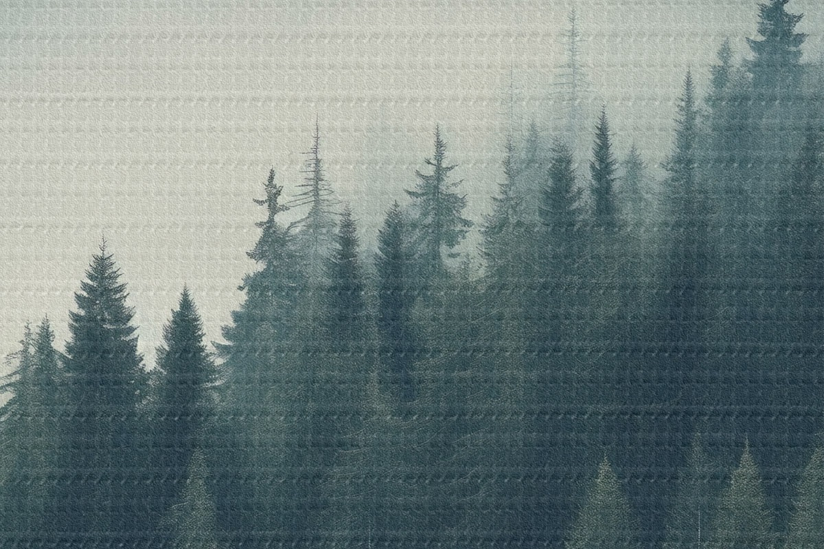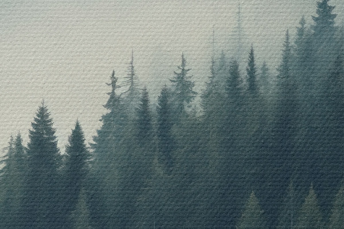 Image Brouillard sur les pentes couvertes de conifères, tons vert foncé Nr r46516