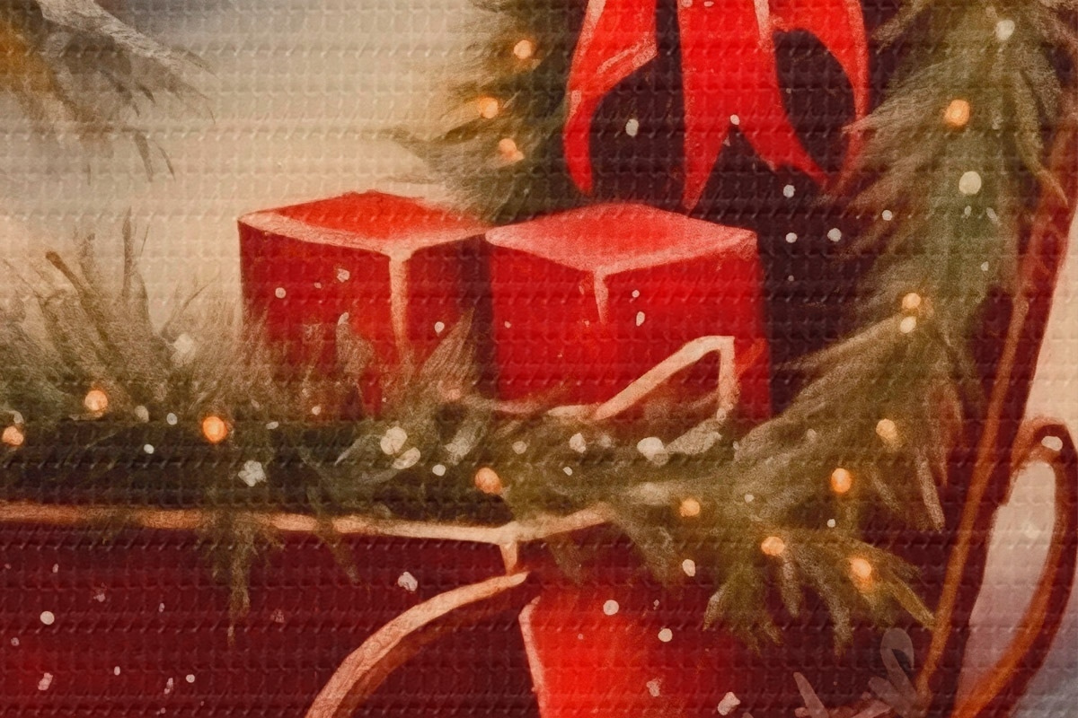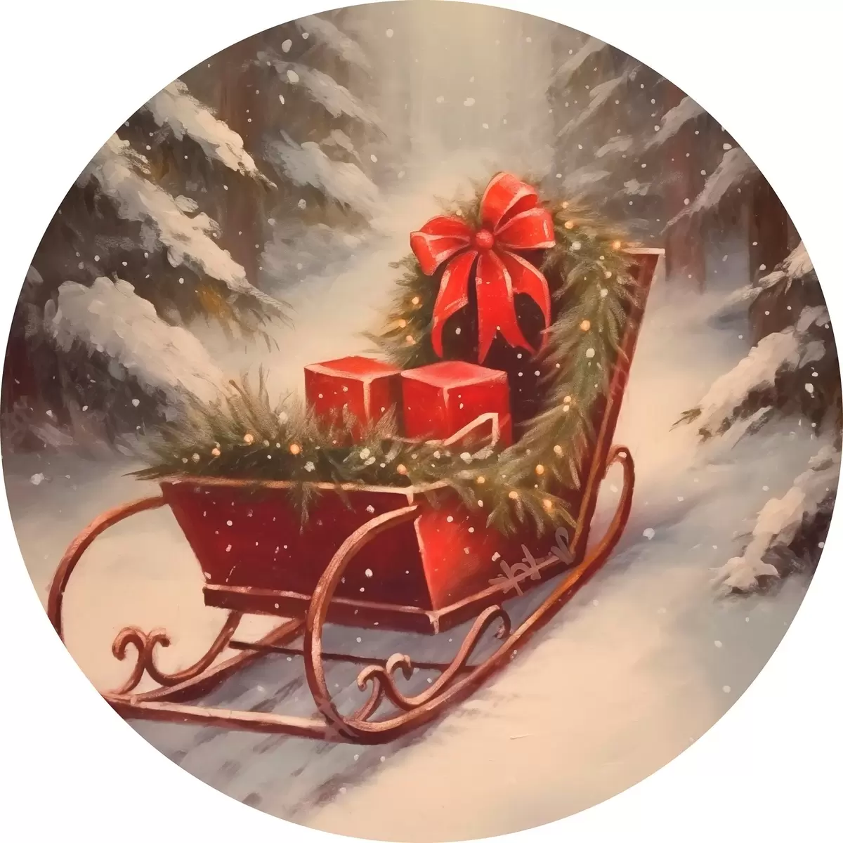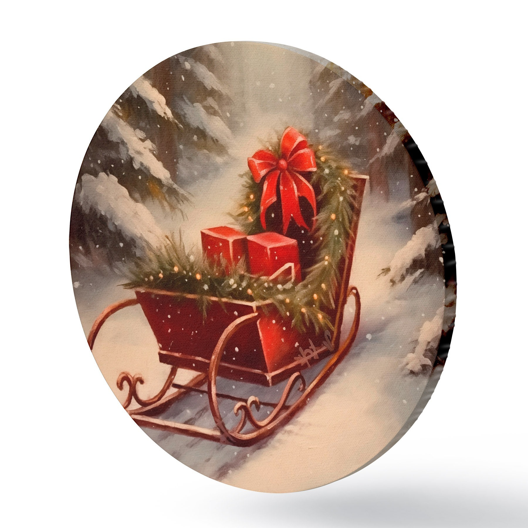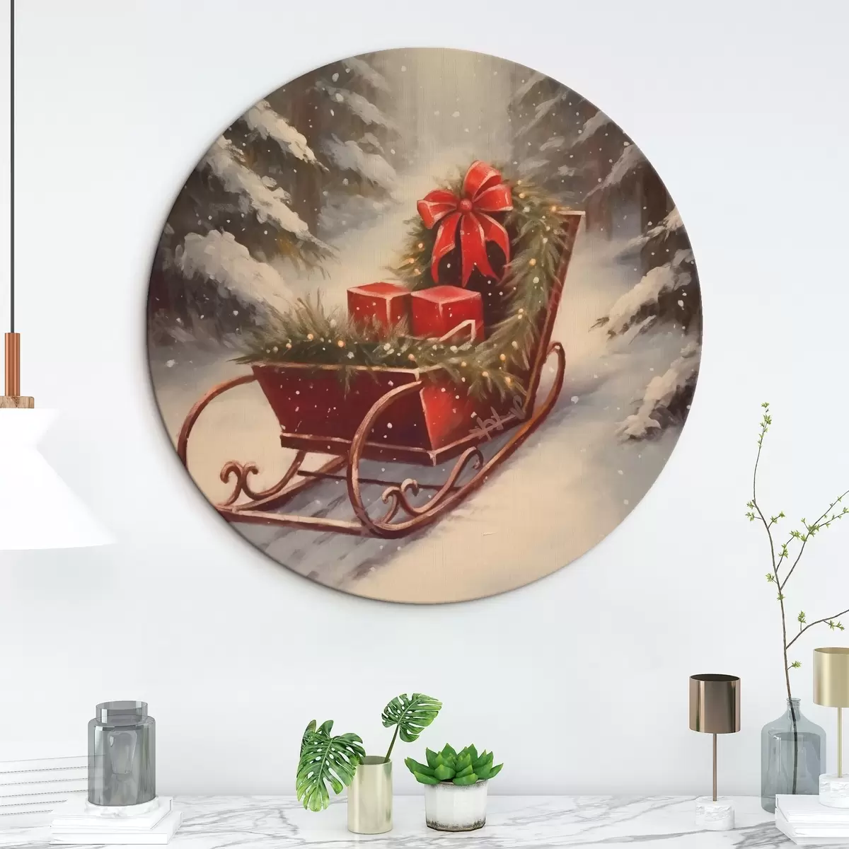 Tableaux ronds Traîneau de Noël avec des cadeaux dans une forêt enneigée r46630