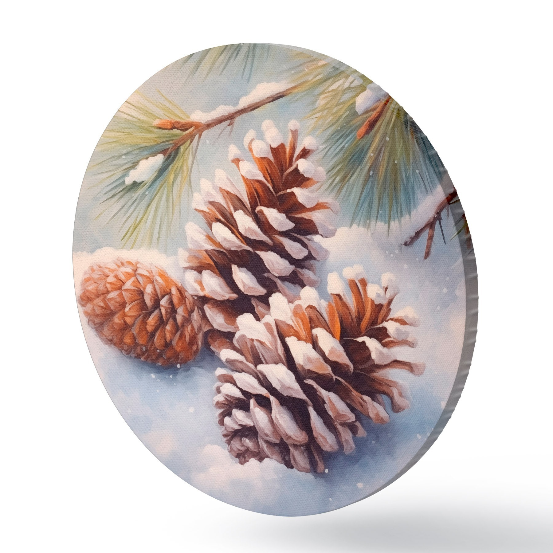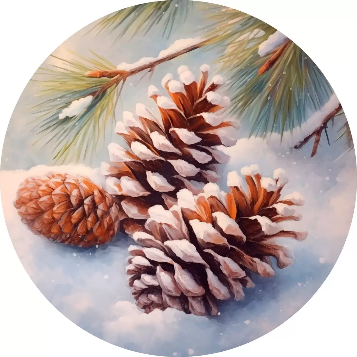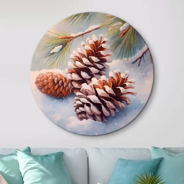 Tableaux ronds Pommes de pin et branches recouvertes de neige r46631