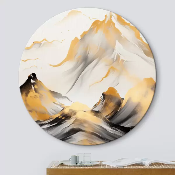 Tableaux ronds Montagnes texturées jaunes et noires aux sommets enneigés, style peinture à l'encre, chaîne de montagnes minimaliste r46683