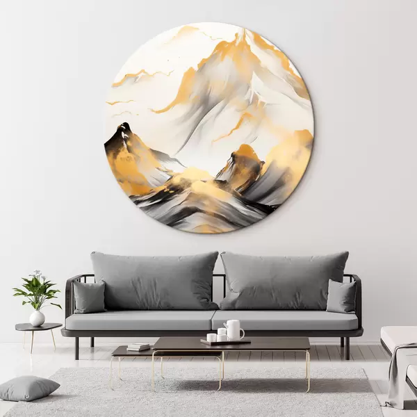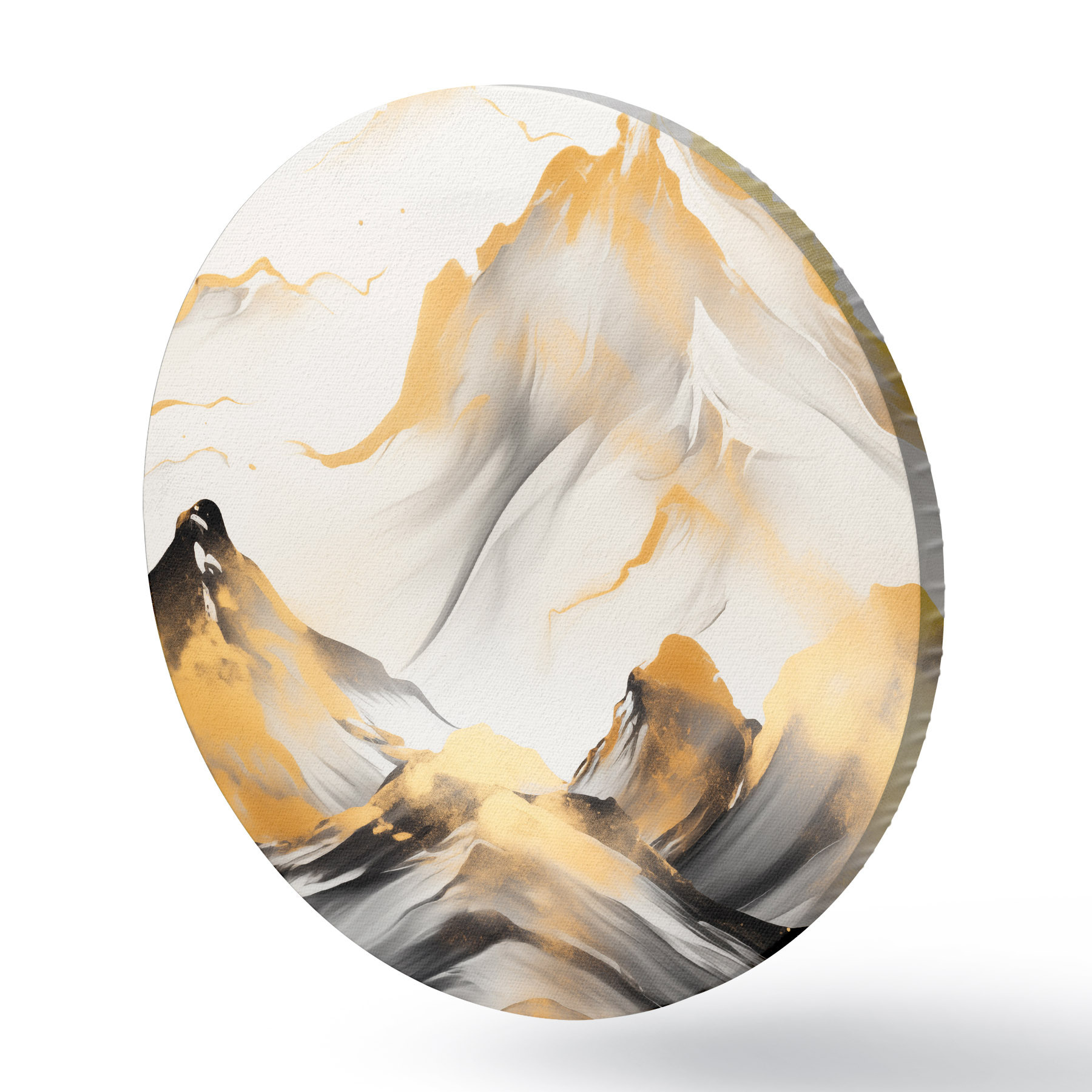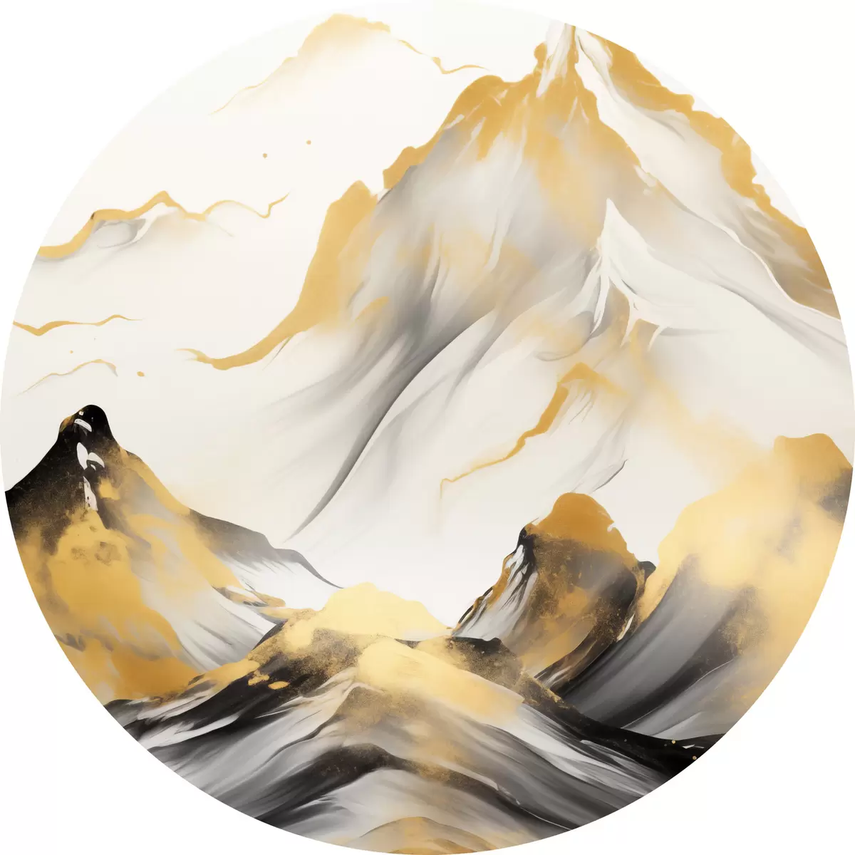Tableaux ronds Montagnes texturées jaunes et noires aux sommets enneigés, style peinture à l'encre, chaîne de montagnes minimaliste r46683