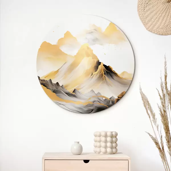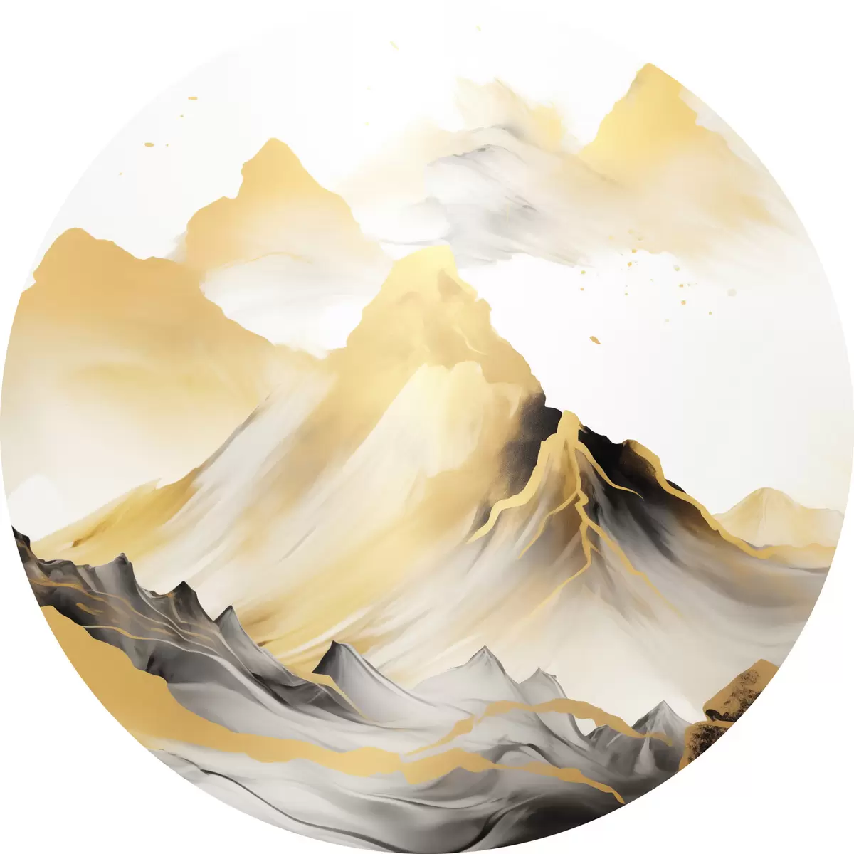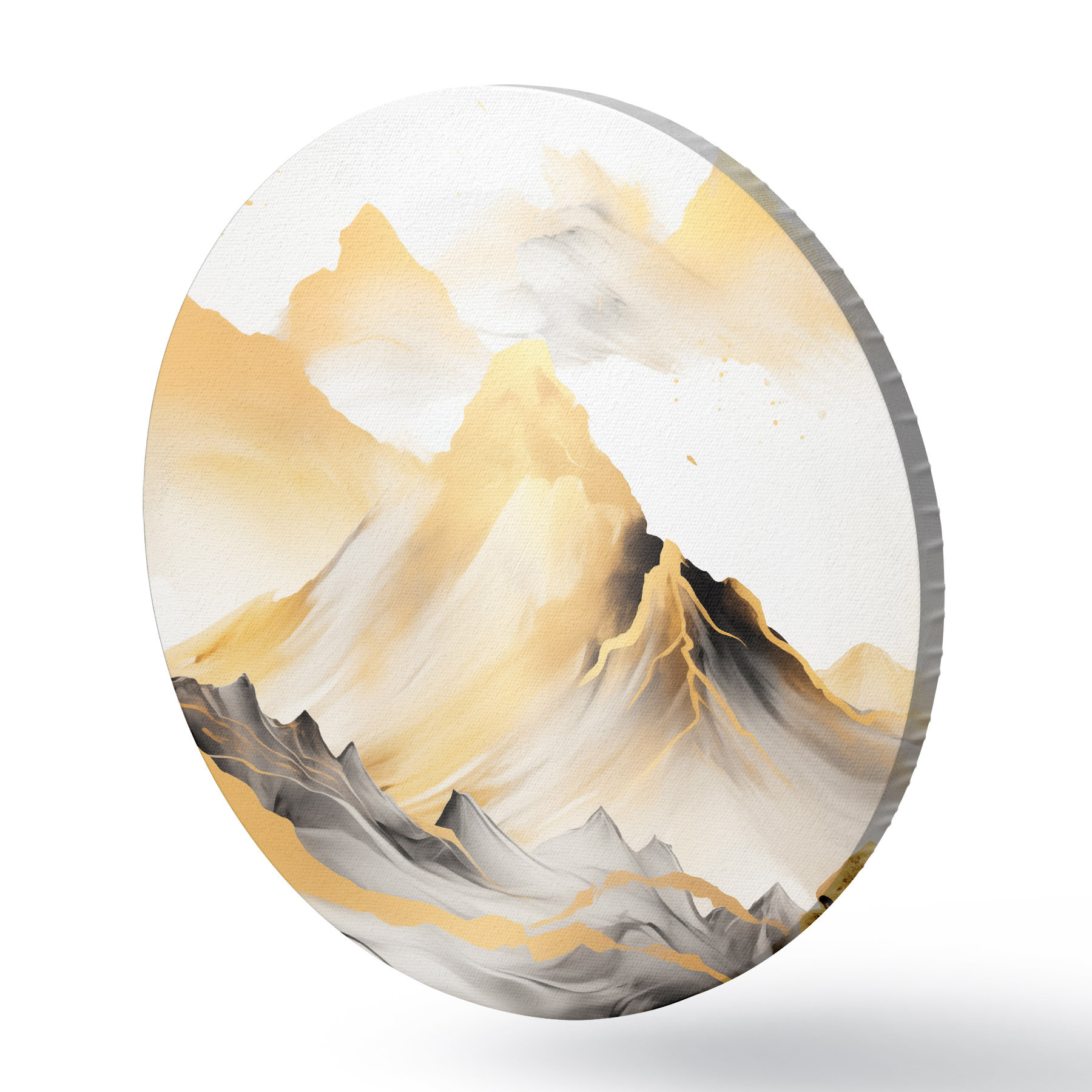 Tableaux ronds Montagnes texturées jaunes et noires aux sommets enneigés, style peinture à l'encre, chaîne de montagnes minimaliste r46684