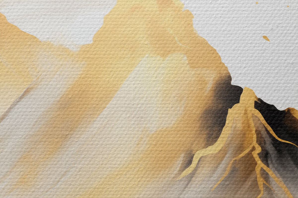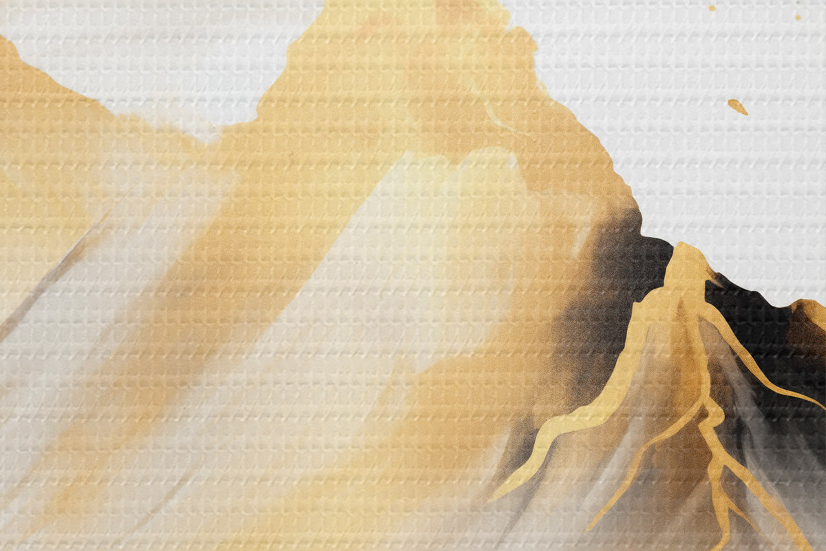 Image Montagnes texturées jaunes et noires aux sommets enneigés, style peinture à l'encre, chaîne de montagnes minimaliste Nr r46684