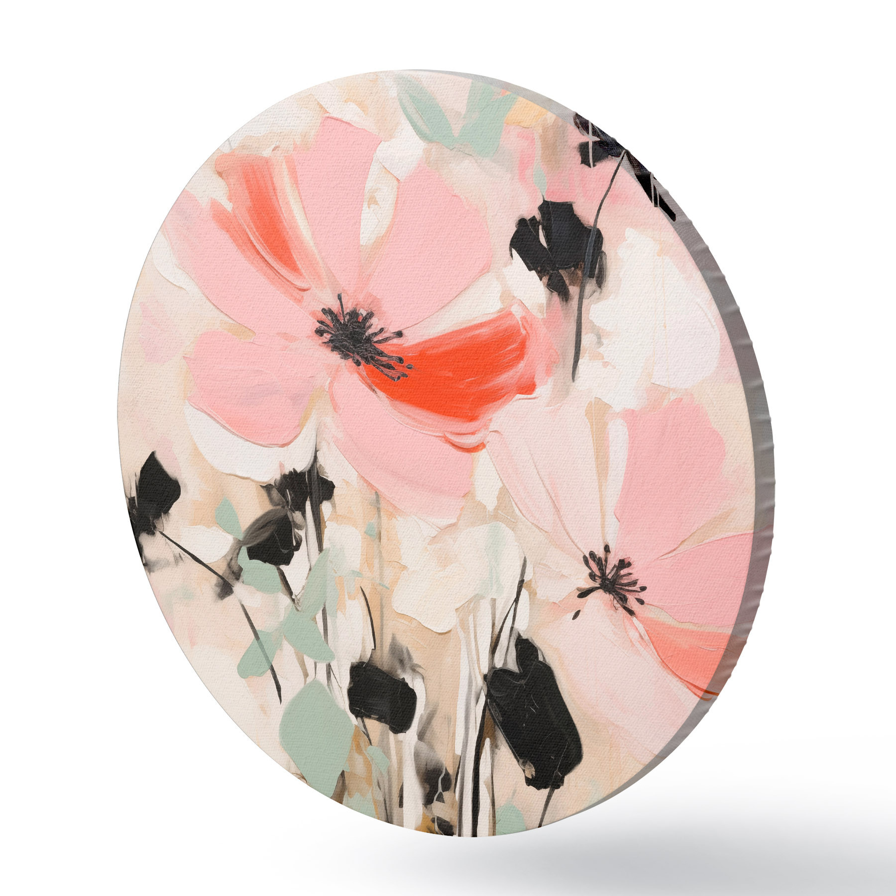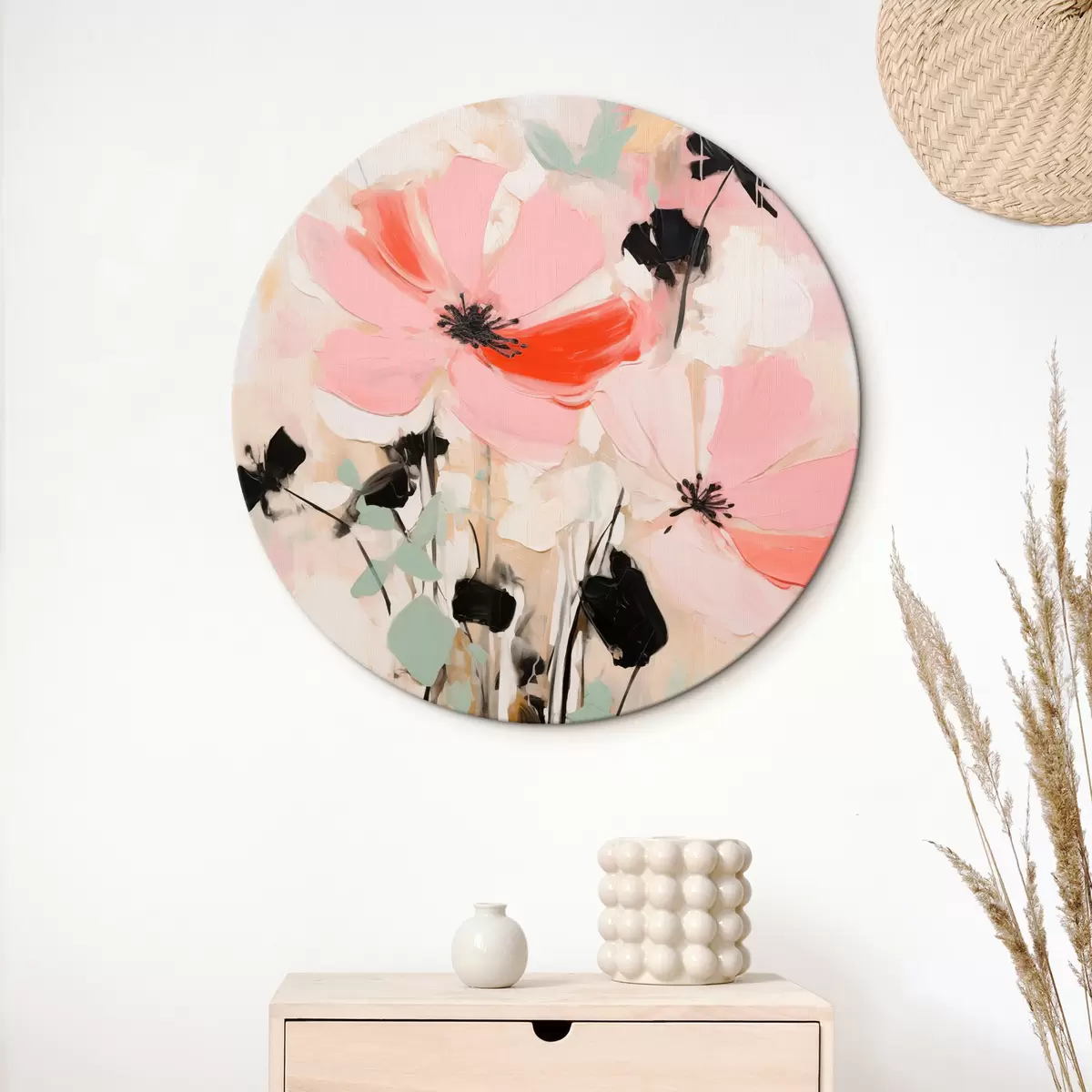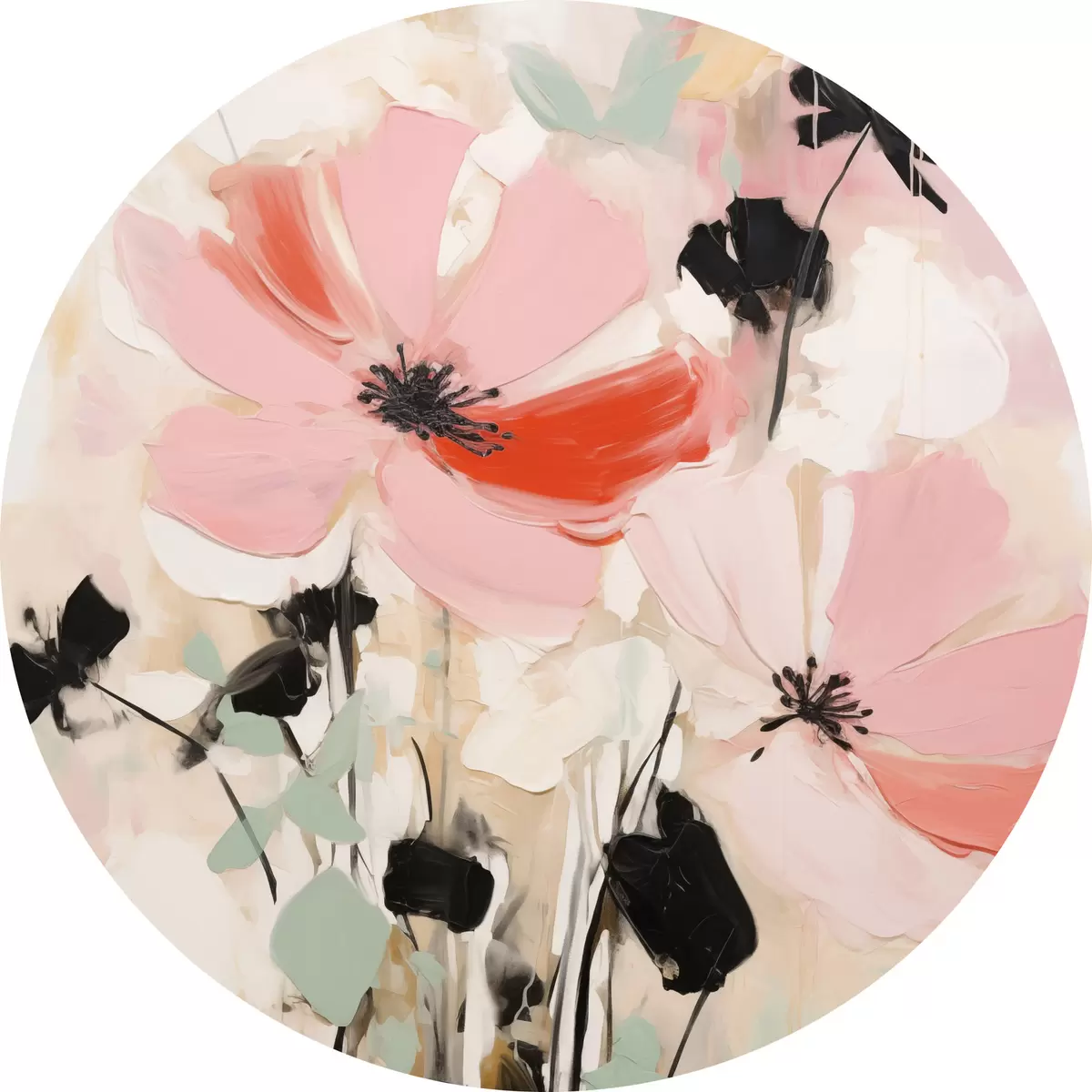 Tableaux ronds Fleurs roses et noires avec des feuilles, couleurs pastel douces, composition florale abstraite, art minimaliste r46687