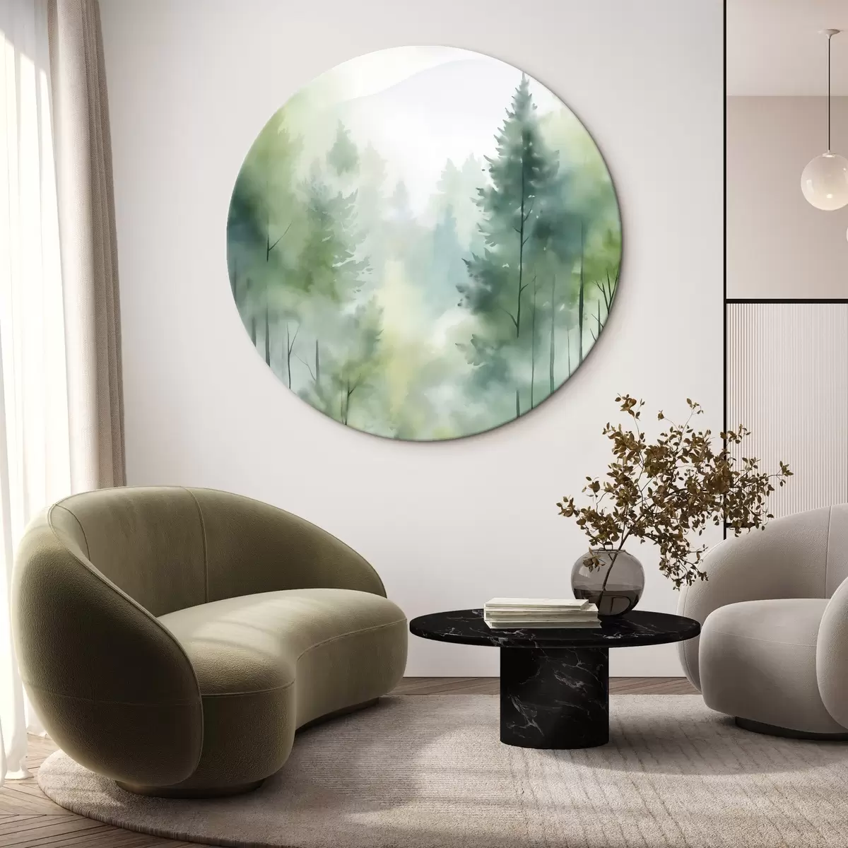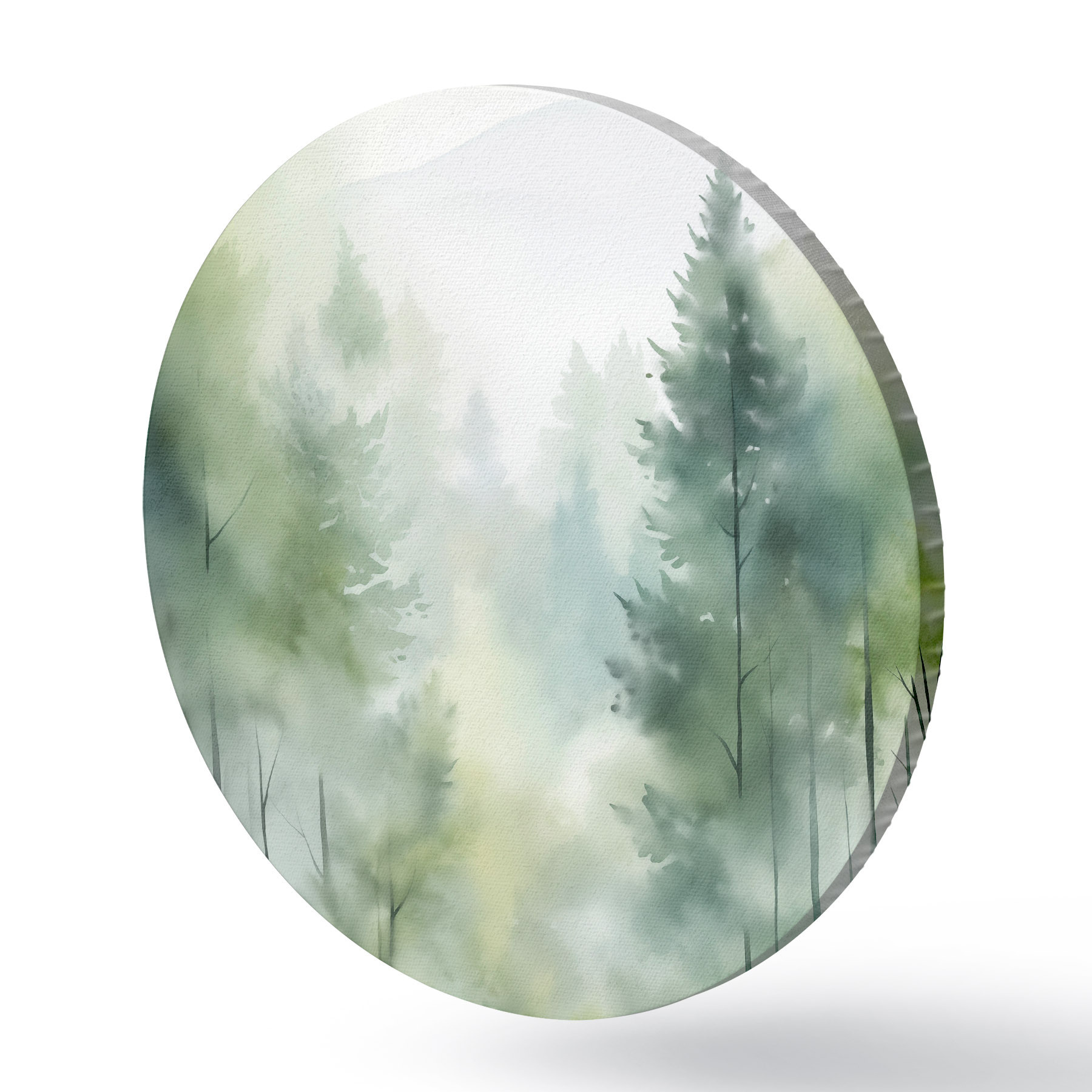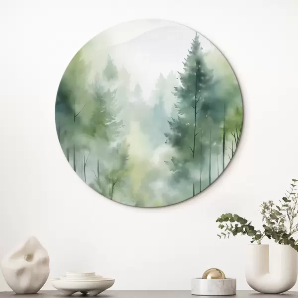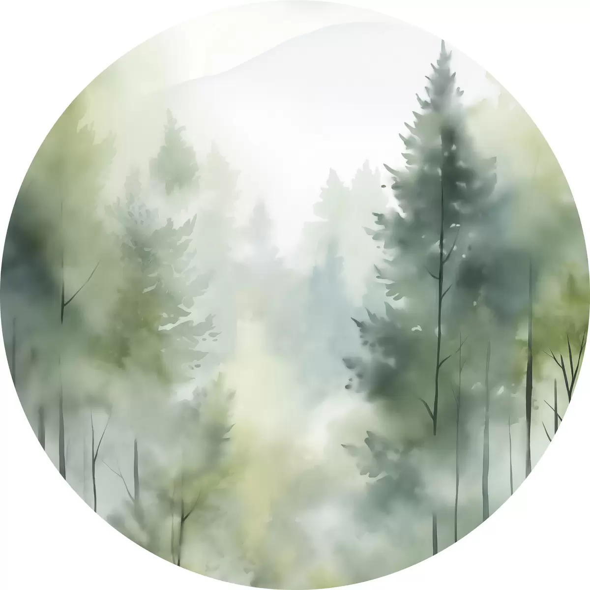 Tableaux ronds Imitation d'une aquarelle représentant une forêt brumeuse avec de grands pins et des montagnes en arrière-plan. r46690