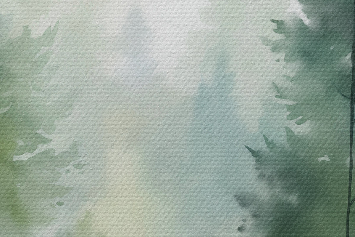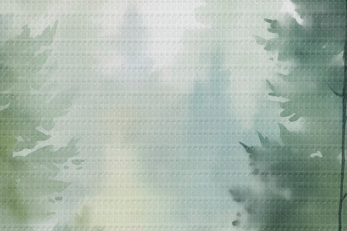 Image Imitation d'une aquarelle représentant une forêt brumeuse avec de grands pins et des montagnes en arrière-plan. Nr r46690