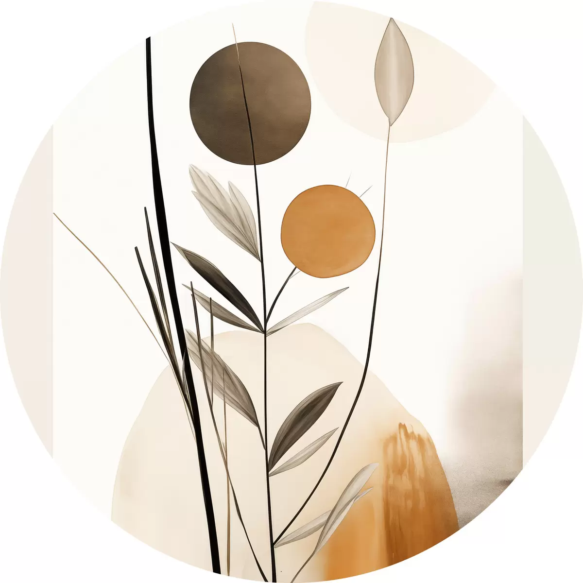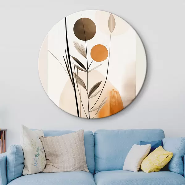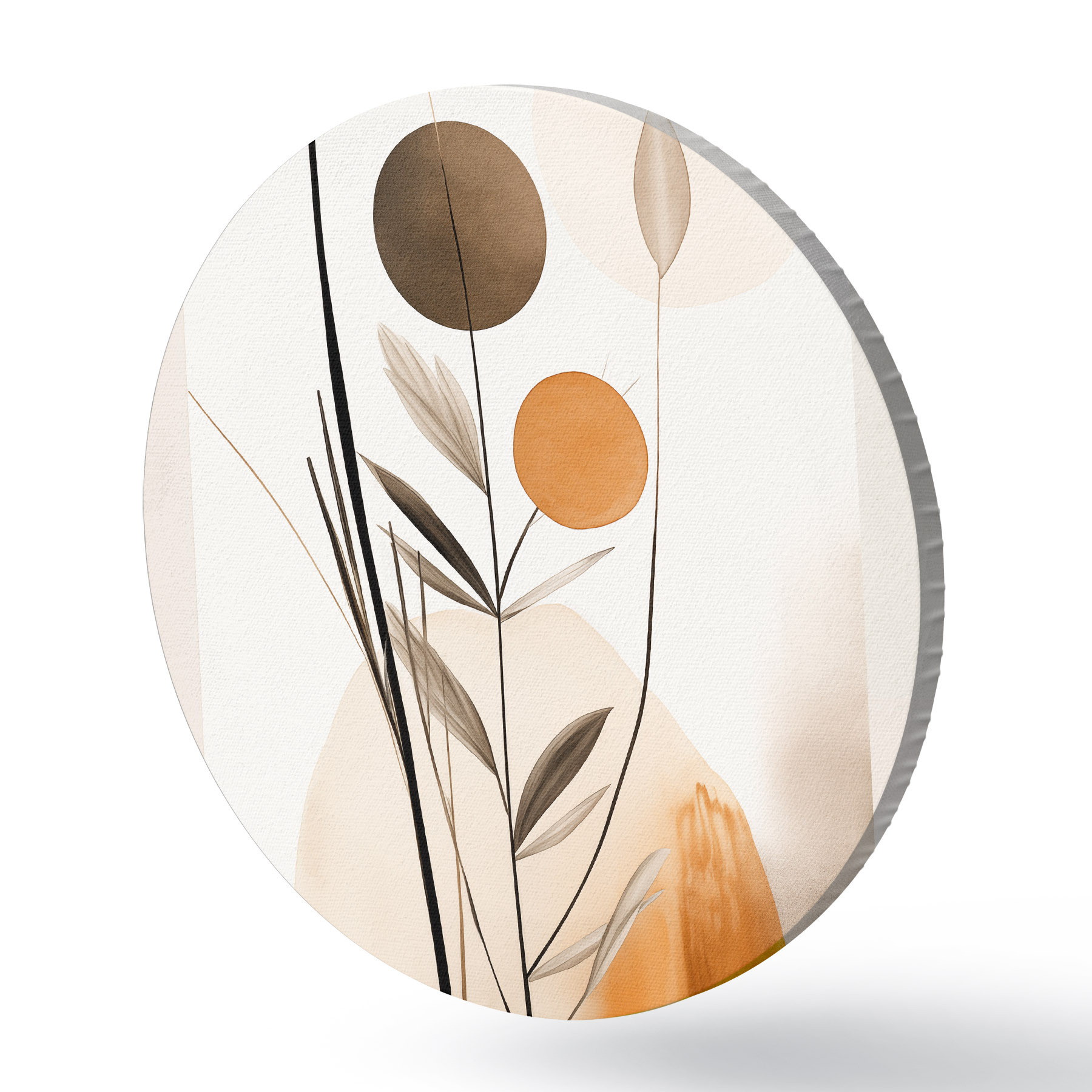 Tableaux ronds Imitation de peinture abstraite avec des cercles orange et gris, des feuilles et des branches, style moderne, effet aquarelle r46698