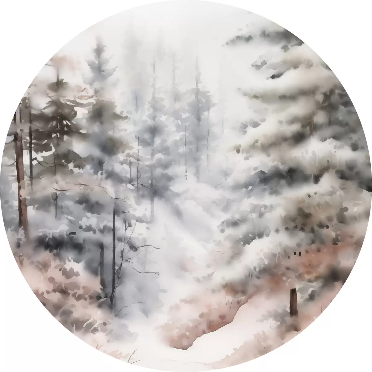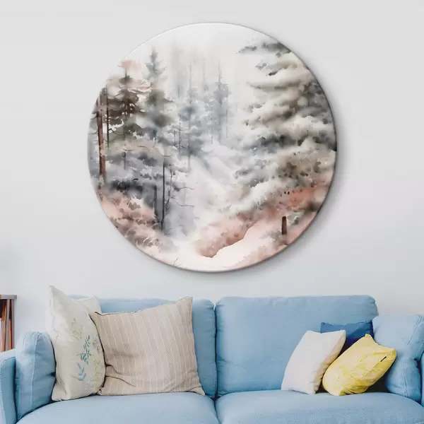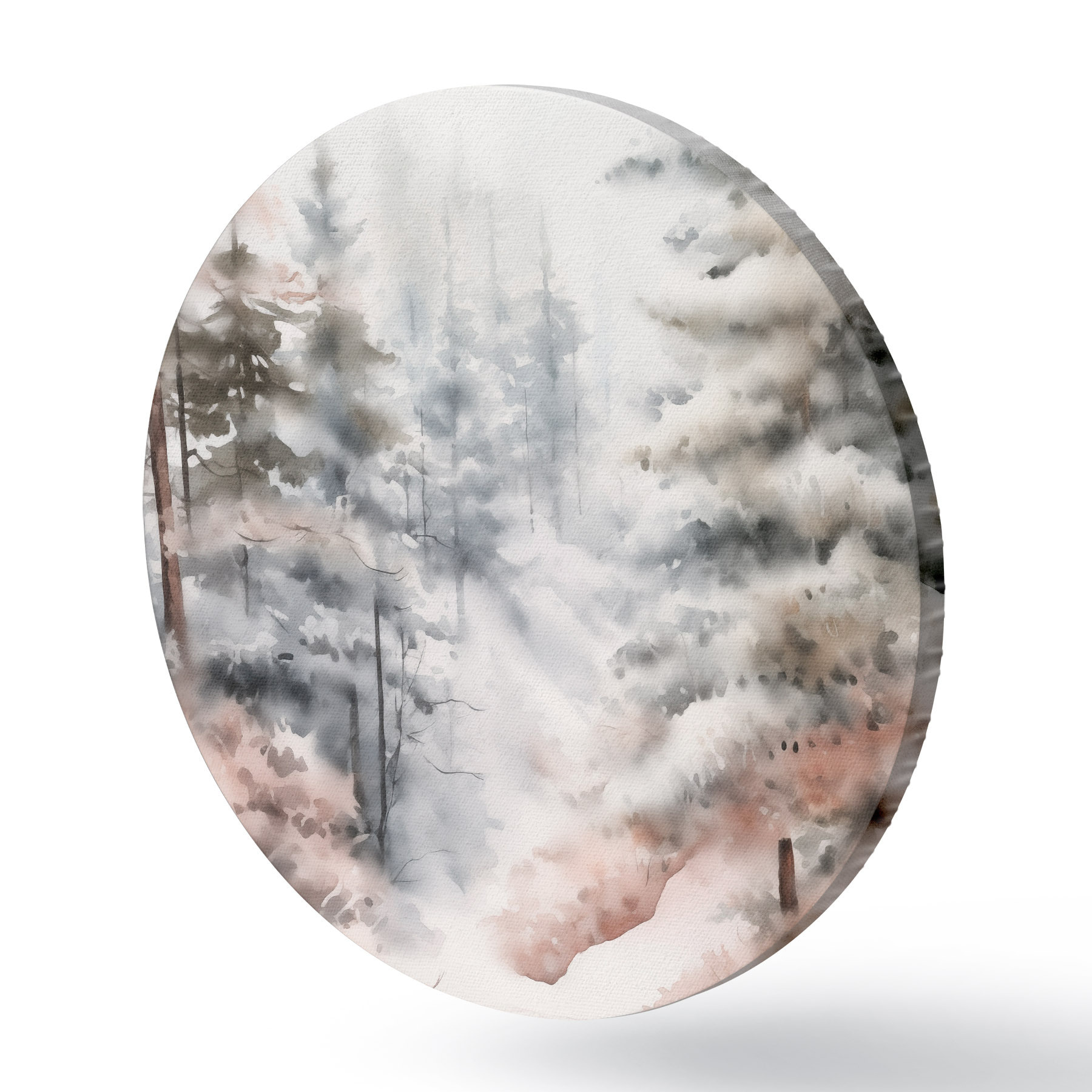 Tableaux ronds De grands pins recouverts de neige, dressés dans une forêt brumeuse, une scène hivernale douce et feutrée. r46702