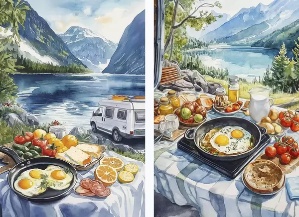 Poster Ontbijt in de natuur, reizen, buitenleven, aquarelstijl, Noorwegen Nr d00404