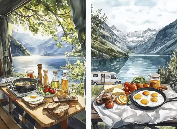 Poster Camping, esthetisch ontbijt bij het meer, aquarelstijl Nr d00405