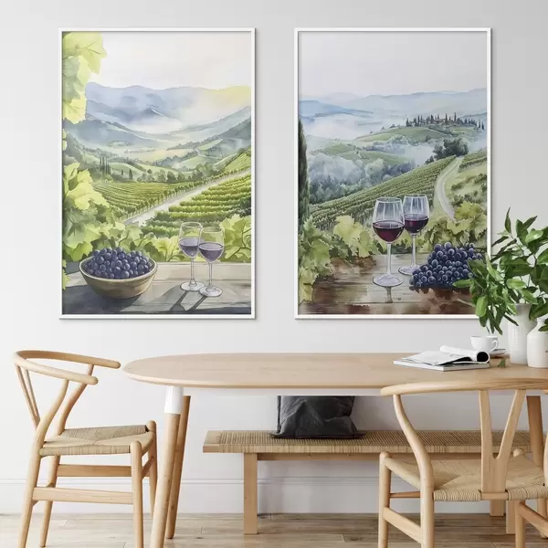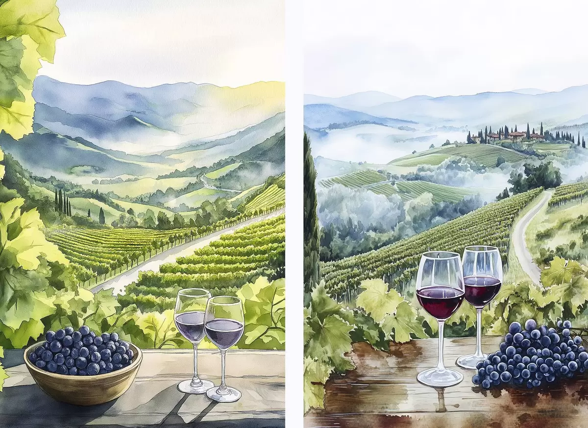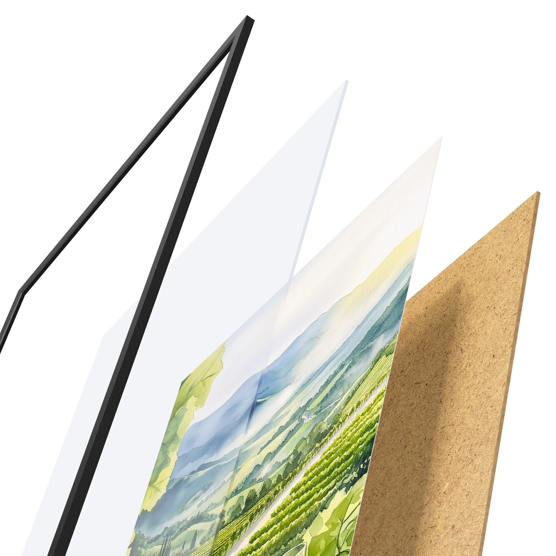 Poster Mooie Toscaanse landschappen, wijngaarden, wijnglazen, aquarel stijl, Italië Nr d00408