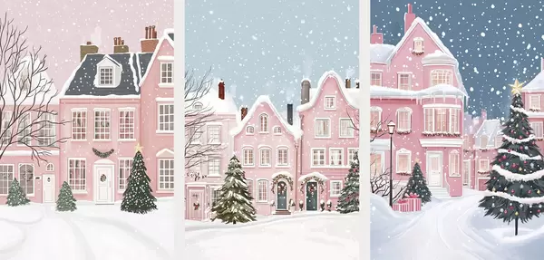 Poster Prachtige winterstad met roze huizen, dennenbomen, sneeuwvlokken d00410