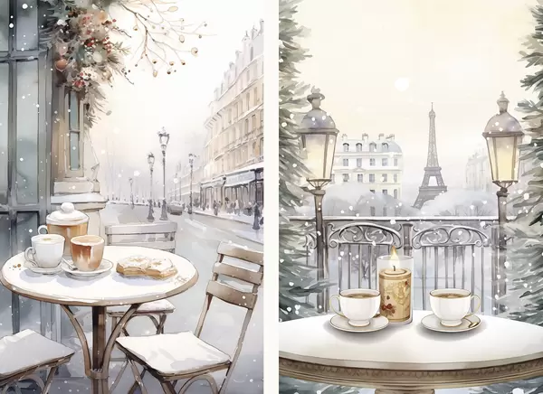 Poster Esthetische cafés met kopjes koffie, straat in de stad Parijs, winter, architectuur Nr d00413