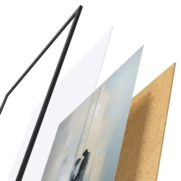 De poster bestaat uit een frame, plexiglas, geprinte afbeelding en spaanplaat achterkant. De poster kan meteen aan de muur worden gehangen dankzij de bevestigingen op de achterkant.