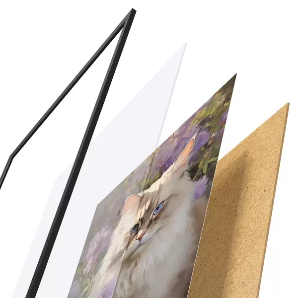 De poster bestaat uit een frame, plexiglas, geprinte afbeelding en spaanplaat achterkant. De poster kan meteen aan de muur worden gehangen dankzij de bevestigingen op de achterkant.