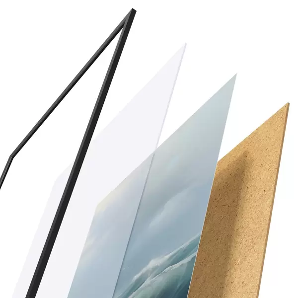 De poster bestaat uit een frame, plexiglas, geprinte afbeelding en spaanplaat achterkant. De poster kan meteen aan de muur worden gehangen dankzij de bevestigingen op de achterkant.