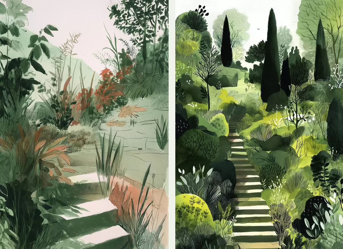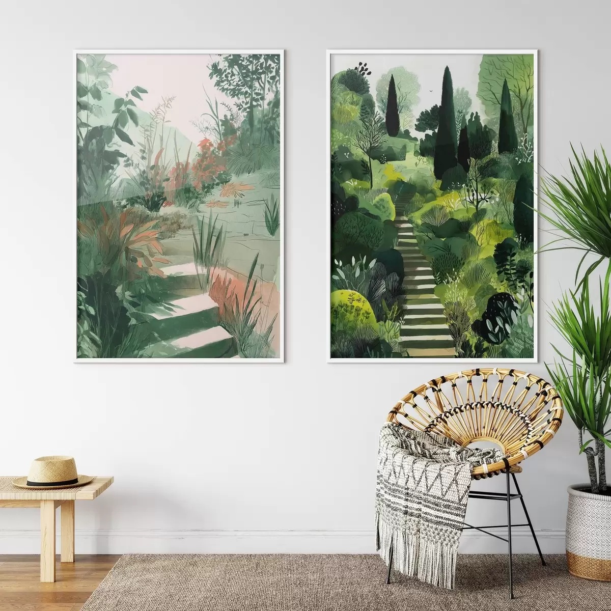 Poster Groene oosterse tuin met struiken en bomen Nr d00478