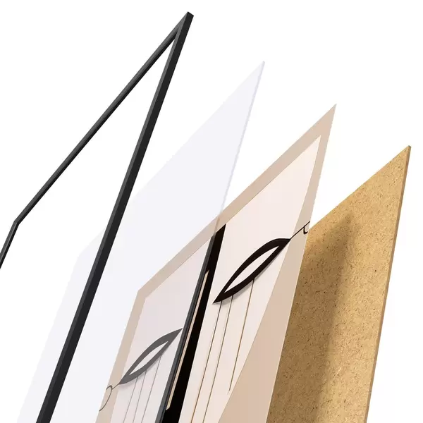 De poster bestaat uit een frame, plexiglas, geprinte afbeelding en spaanplaat achterkant. De poster kan meteen aan de muur worden gehangen dankzij de bevestigingen op de achterkant.
