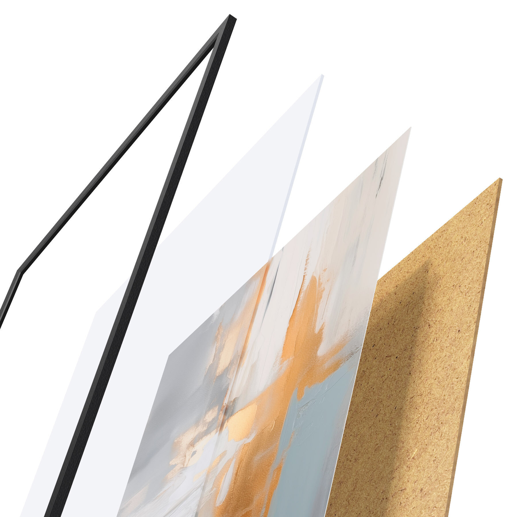 De poster bestaat uit een frame, plexiglas, geprinte afbeelding en spaanplaat achterkant. De poster kan meteen aan de muur worden gehangen dankzij de bevestigingen op de achterkant.