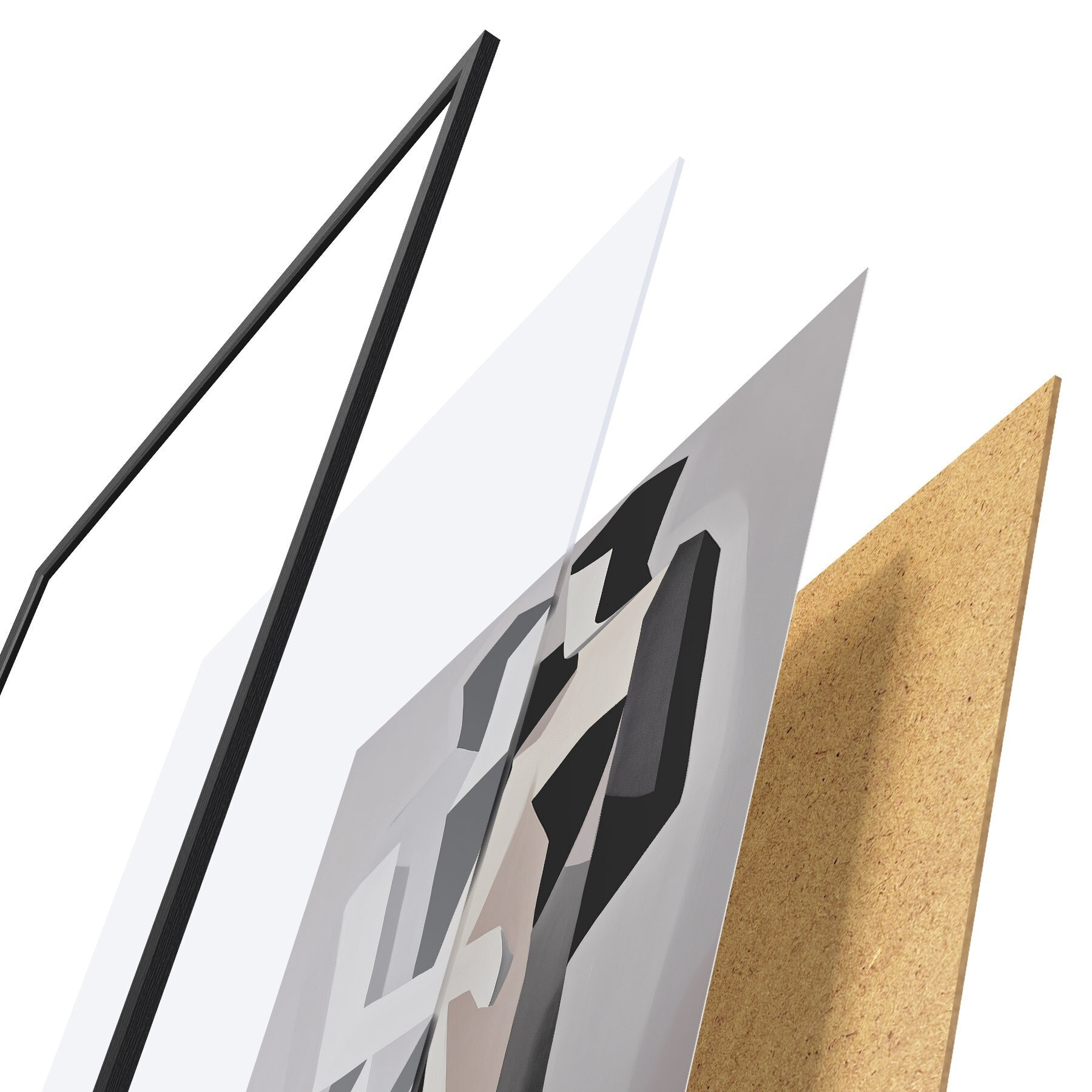 De poster bestaat uit een frame, plexiglas, geprinte afbeelding en spaanplaat achterkant. De poster kan meteen aan de muur worden gehangen dankzij de bevestigingen op de achterkant.