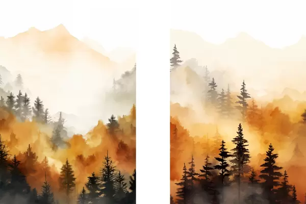Poster Een landschap aquarel imitatie van een bos met hoge pijnbomen en bergen op de achtergrond Nr d00519
