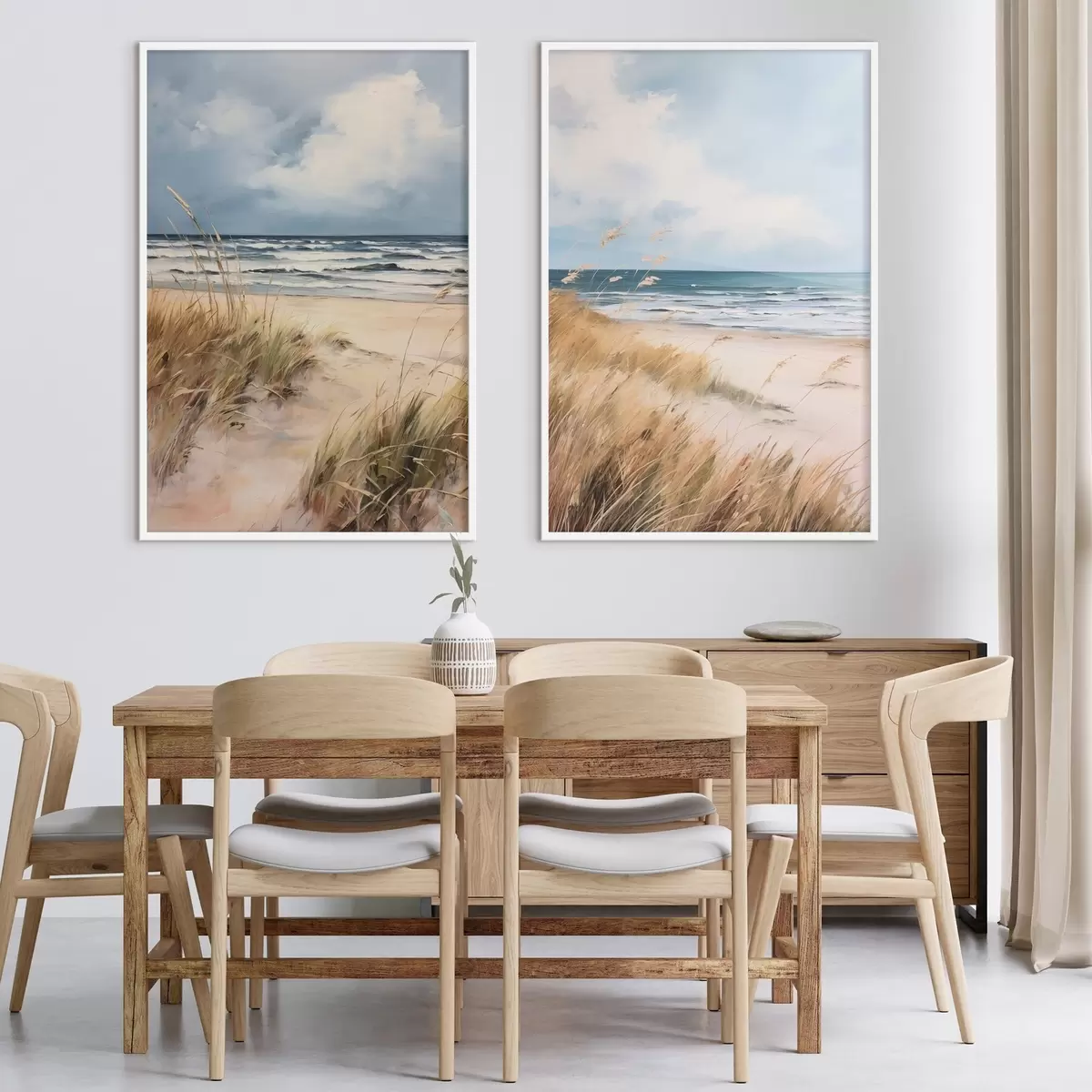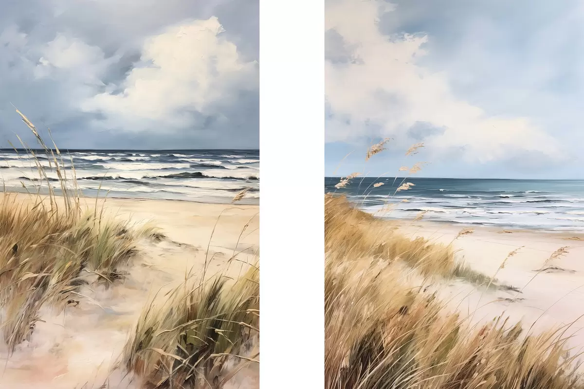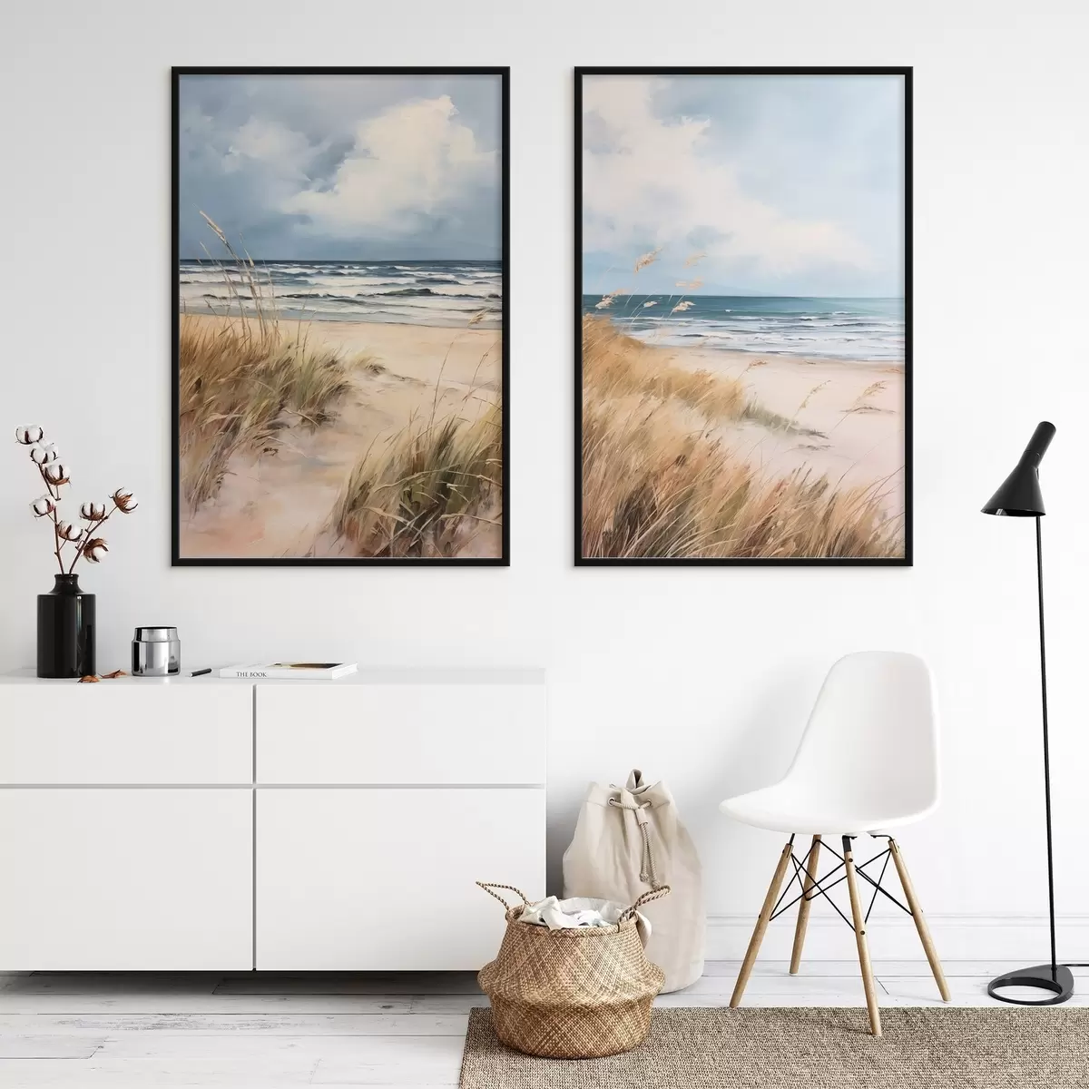 Poster Een zandstrand met hoog gras op de voorgrond, de oceaan met golven en een bewolkte lucht op de achtergrond Nr d00521