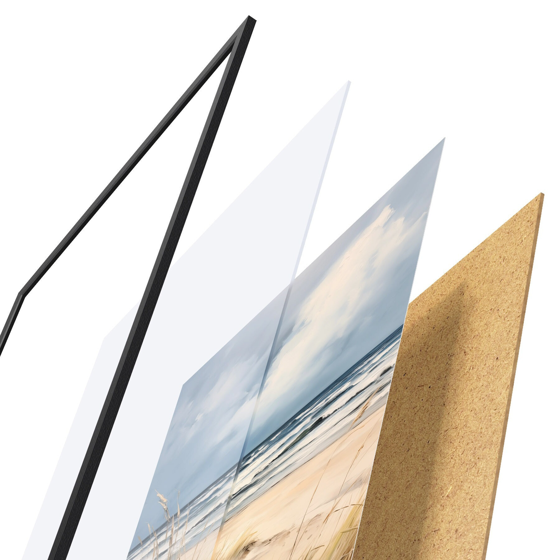 De poster bestaat uit een frame, plexiglas, geprinte afbeelding en spaanplaat achterkant. De poster kan meteen aan de muur worden gehangen dankzij de bevestigingen op de achterkant.