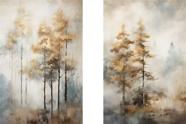 Poster Hoge bomen met gele bladeren in een bos, de achtergrond is een mix van zachte blauwe en bruine tinten Nr d00528