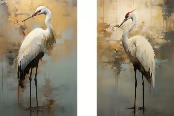 Poster Witte reiger tegen een achtergrond van gedempte gele, bruine en blauwe tinten die een mistig, abstract landschap suggereren Nr d00530