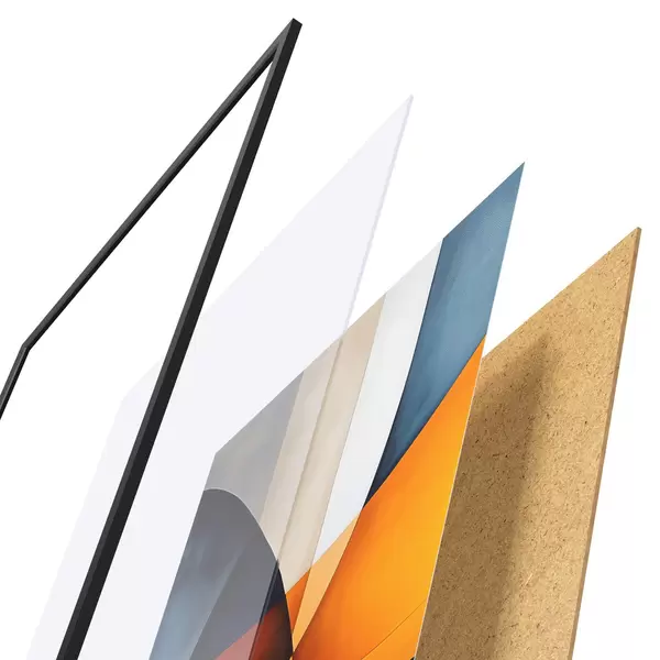 De poster bestaat uit een frame, plexiglas, geprinte afbeelding en spaanplaat achterkant. De poster kan meteen aan de muur worden gehangen dankzij de bevestigingen op de achterkant.