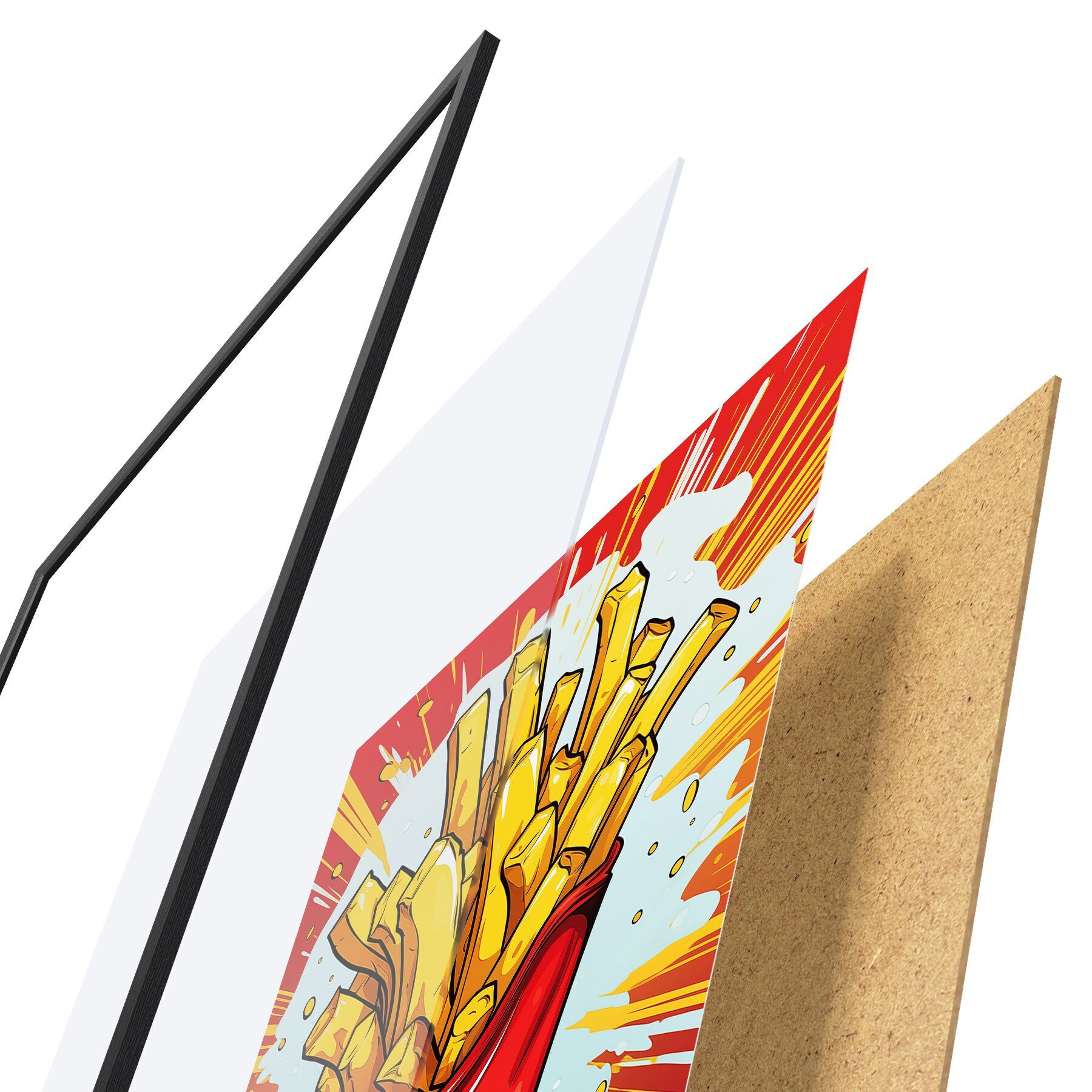 De poster bestaat uit een frame, plexiglas, geprinte afbeelding en spaanplaat achterkant. De poster kan meteen aan de muur worden gehangen dankzij de bevestigingen op de achterkant.