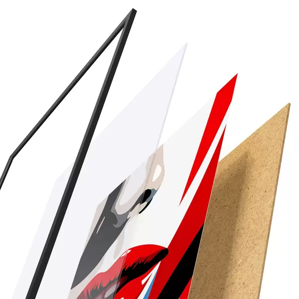 De poster bestaat uit een frame, plexiglas, geprinte afbeelding en spaanplaat achterkant. De poster kan meteen aan de muur worden gehangen dankzij de bevestigingen op de achterkant.