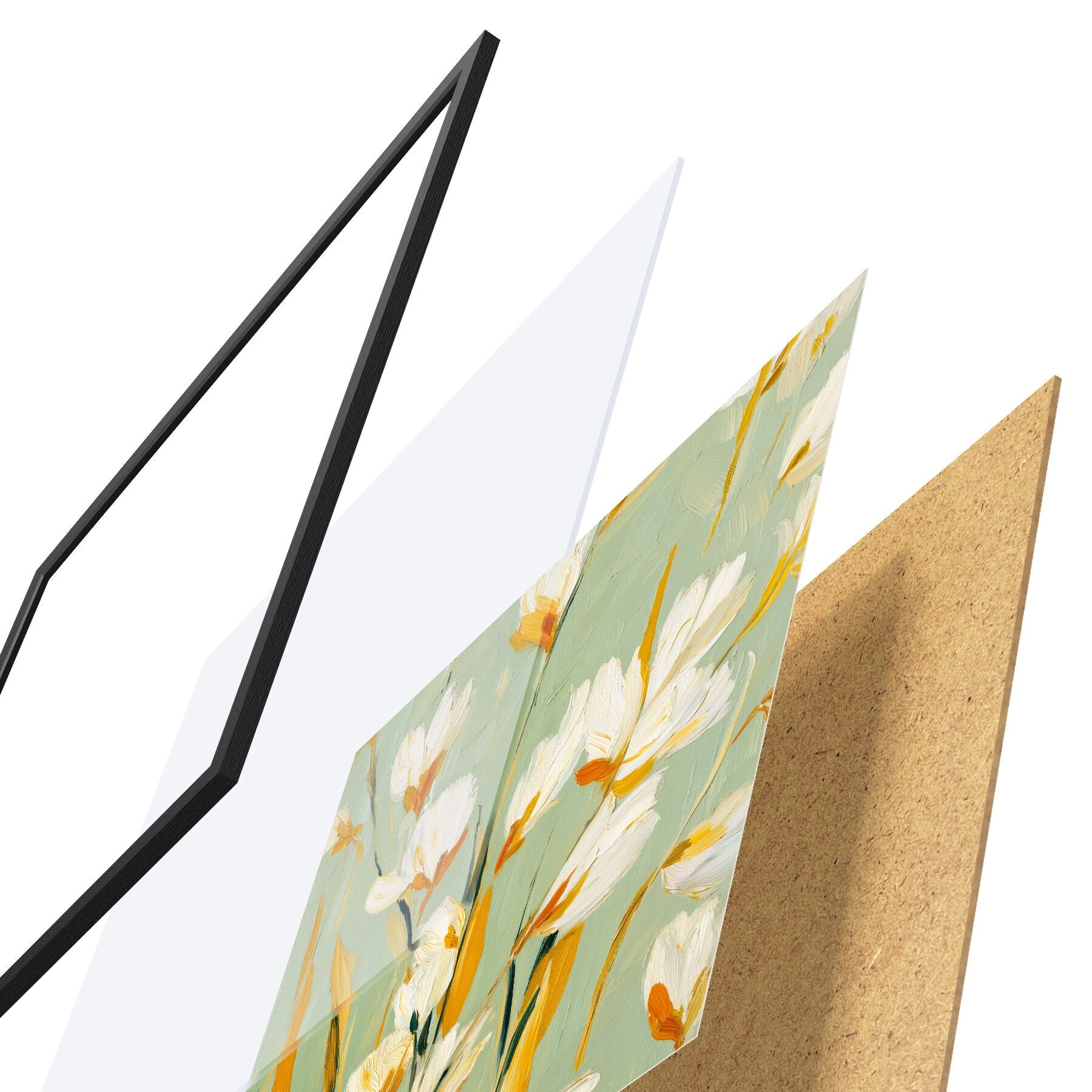 De poster bestaat uit een frame, plexiglas, geprinte afbeelding en spaanplaat achterkant. De poster kan meteen aan de muur worden gehangen dankzij de bevestigingen op de achterkant.