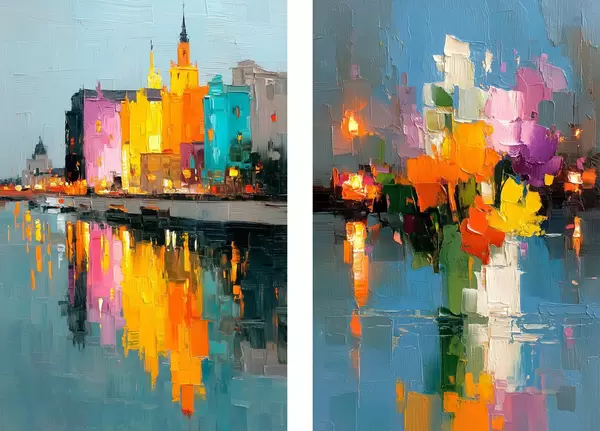 Poster Stadsdynamiek: abstracte compositie met reflecties van lichten op de rivier d00569